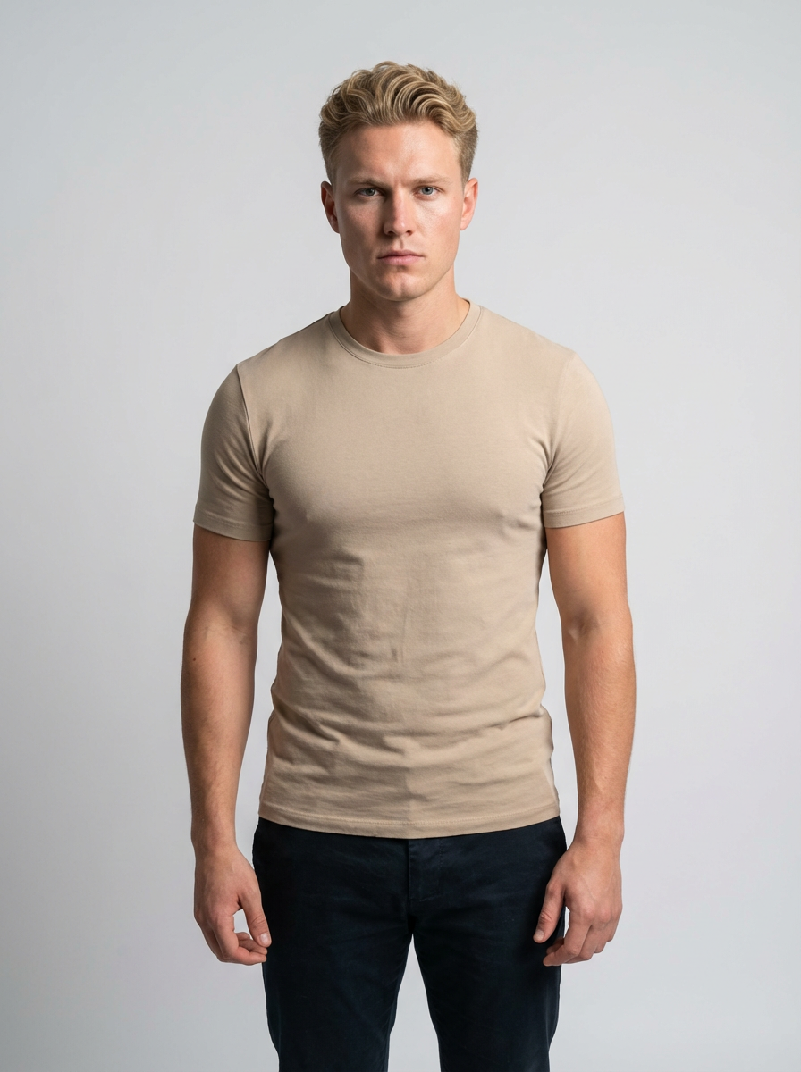 A professional photography model headshot of a confident model, taken in a well-lit studio with a clean, neutral backdrop. The model is dressed in a fitted, neutral-colored crewneck shirt with neatly styled hair, ensuring a polished yet natural look. The lighting is soft and even, accentuating the model\'s bone structure, skin texture, and striking features. The focus is sharp, with a clear emphasis on the model\'s eyes and subtle expression, creating the perfect headshot for agency submissions, portfolio updates, and professional branding in fashion and commercial maning.