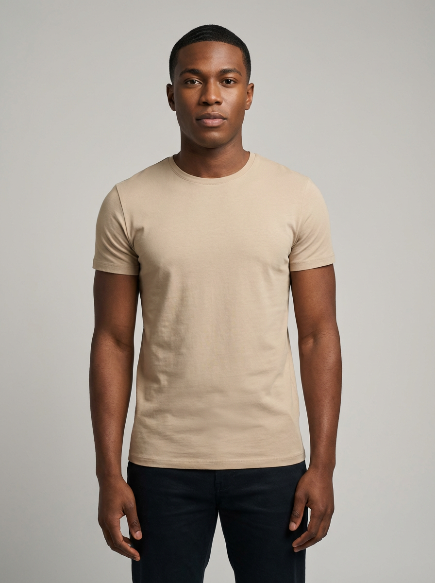 A professional photography model headshot of a confident model, taken in a well-lit studio with a clean, neutral backdrop. The model is dressed in a fitted, neutral-colored crewneck shirt with neatly styled hair, ensuring a polished yet natural look. The lighting is soft and even, accentuating the model\'s bone structure, skin texture, and striking features. The focus is sharp, with a clear emphasis on the model\'s eyes and subtle expression, creating the perfect headshot for agency submissions, portfolio updates, and professional branding in fashion and commercial maning.