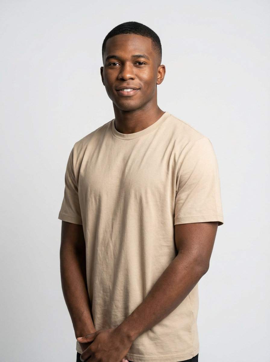 A professional photography model headshot of a confident model, taken in a well-lit studio with a clean, neutral backdrop. The model is dressed in a fitted, neutral-colored crewneck shirt with neatly styled hair, ensuring a polished yet natural look. The lighting is soft and even, accentuating the model\'s bone structure, skin texture, and striking features. The focus is sharp, with a clear emphasis on the model\'s eyes and subtle expression, creating the perfect headshot for agency submissions, portfolio updates, and professional branding in fashion and commercial maning.