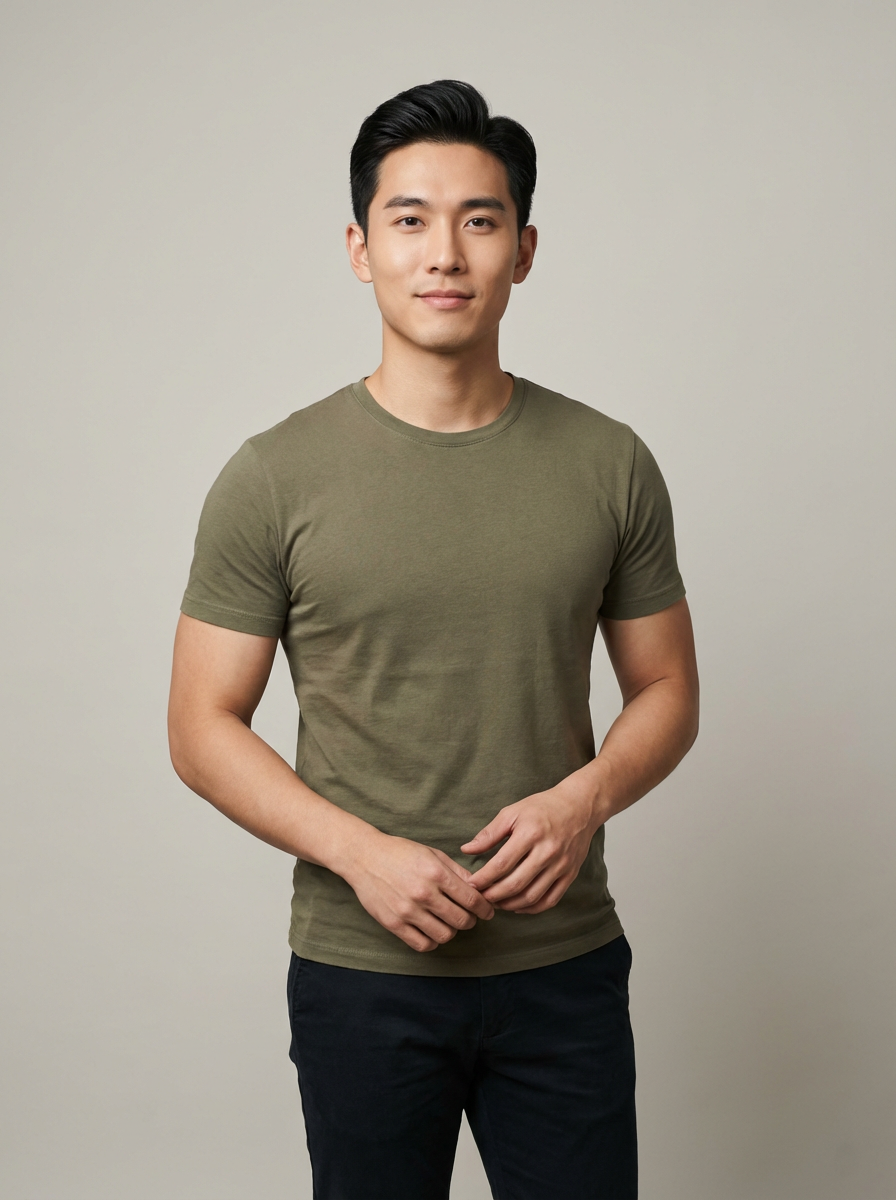 A professional photography model headshot of a confident model, taken in a well-lit studio with a clean, neutral backdrop. The model is dressed in a fitted, neutral-colored crewneck shirt with neatly styled hair, ensuring a polished yet natural look. The lighting is soft and even, accentuating the model\'s bone structure, skin texture, and striking features. The focus is sharp, with a clear emphasis on the model\'s eyes and subtle expression, creating the perfect headshot for agency submissions, portfolio updates, and professional branding in fashion and commercial maning.