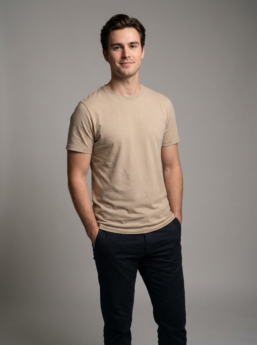 A professional photography model headshot of a confident model, taken in a well-lit studio with a clean, neutral backdrop. The model is dressed in a fitted, neutral-colored crewneck shirt with neatly styled hair, ensuring a polished yet natural look. The lighting is soft and even, accentuating the model\'s bone structure, skin texture, and striking features. The focus is sharp, with a clear emphasis on the model\'s eyes and subtle expression, creating the perfect headshot for agency submissions, portfolio updates, and professional branding in fashion and commercial maning.