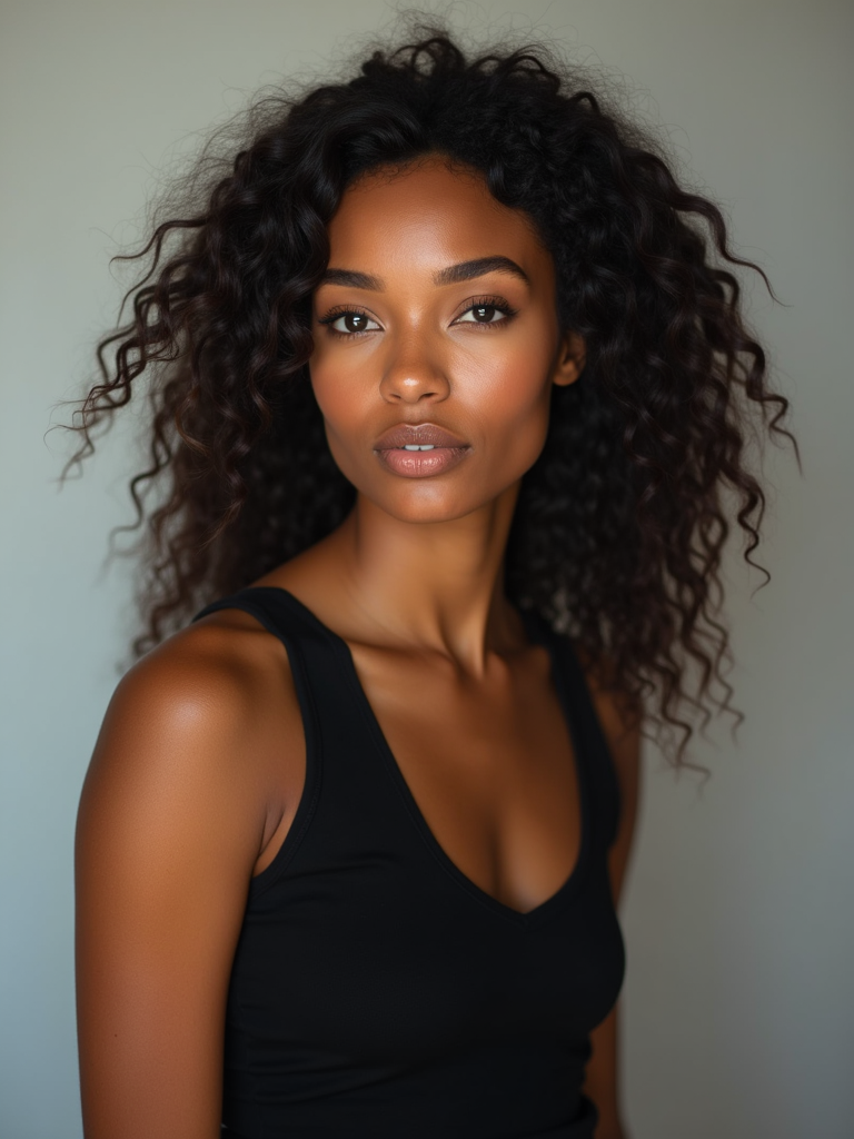 A professional photography model headshot of a confident model, taken in a well-lit studio with a clean, neutral backdrop. The model is dressed in a sleek, minimal black tank top with natural makeup and loose, effortless waves , ensuring a polished yet natural look. The lighting is soft and even, accentuating the model’s bone structure, skin texture, and striking features. The focus is sharp, with a clear emphasis on the model\'s eyes and subtle expression, creating the perfect headshot for agency submissions, portfolio updates, and professional branding in fashion and commercial womaning.