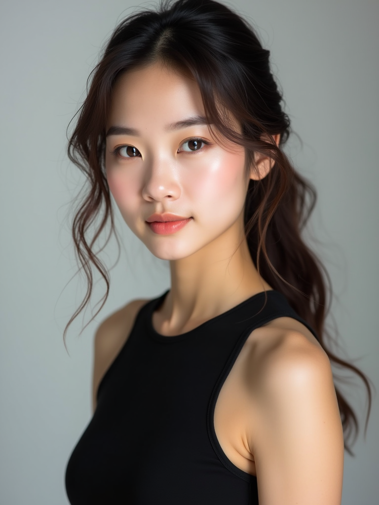 A professional photography model headshot of a confident model, taken in a well-lit studio with a clean, neutral backdrop. The model is dressed in a sleek, minimal black tank top with natural makeup and loose, effortless waves , ensuring a polished yet natural look. The lighting is soft and even, accentuating the model’s bone structure, skin texture, and striking features. The focus is sharp, with a clear emphasis on the model\'s eyes and subtle expression, creating the perfect headshot for agency submissions, portfolio updates, and professional branding in fashion and commercial womaning.