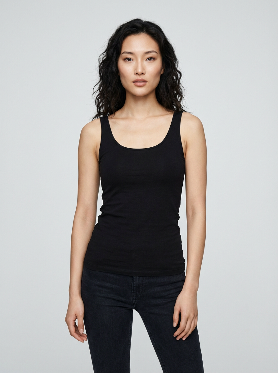 A professional photography model headshot of a confident model, taken in a well-lit studio with a clean, neutral backdrop. The model is dressed in a sleek, minimal black tank top with natural makeup and loose, effortless waves , ensuring a polished yet natural look. The lighting is soft and even, accentuating the model\'s bone structure, skin texture, and striking features. The focus is sharp, with a clear emphasis on the model\'s eyes and subtle expression, creating the perfect headshot for agency submissions, portfolio updates, and professional branding in fashion and commercial womaning.