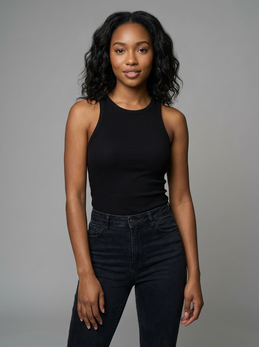 A professional photography model headshot of a confident model, taken in a well-lit studio with a clean, neutral backdrop. The model is dressed in a sleek, minimal black tank top with natural makeup and loose, effortless waves , ensuring a polished yet natural look. The lighting is soft and even, accentuating the model\'s bone structure, skin texture, and striking features. The focus is sharp, with a clear emphasis on the model\'s eyes and subtle expression, creating the perfect headshot for agency submissions, portfolio updates, and professional branding in fashion and commercial womaning.
