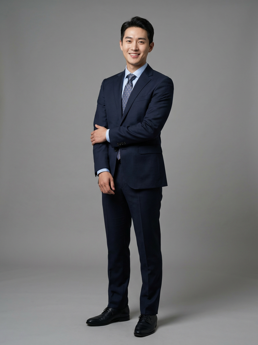 A professional real estate agent headshot of a confident model, taken in a well-lit studio with a plain backdrop. The model is dressed in a sharp suit with a neat tie and a confident expression. The lighting is soft and even, highlighting their facial features with a professional and approachable expression. The focus is sharp, capturing the model's eyes and engaging smile, creating a perfect headshot for real estate listings and professional profiles.