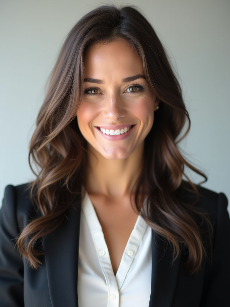 A professional real estate agent headshot of a confident model, taken in a well-lit studio with a plain backdrop. The model is dressed in a tailored blazer with a crisp blouse and a welcoming smile . The lighting is soft and even, highlighting their facial features with a professional and approachable expression. The focus is sharp, capturing the model's eyes and engaging smile, creating a perfect headshot for real estate listings and professional profiles.