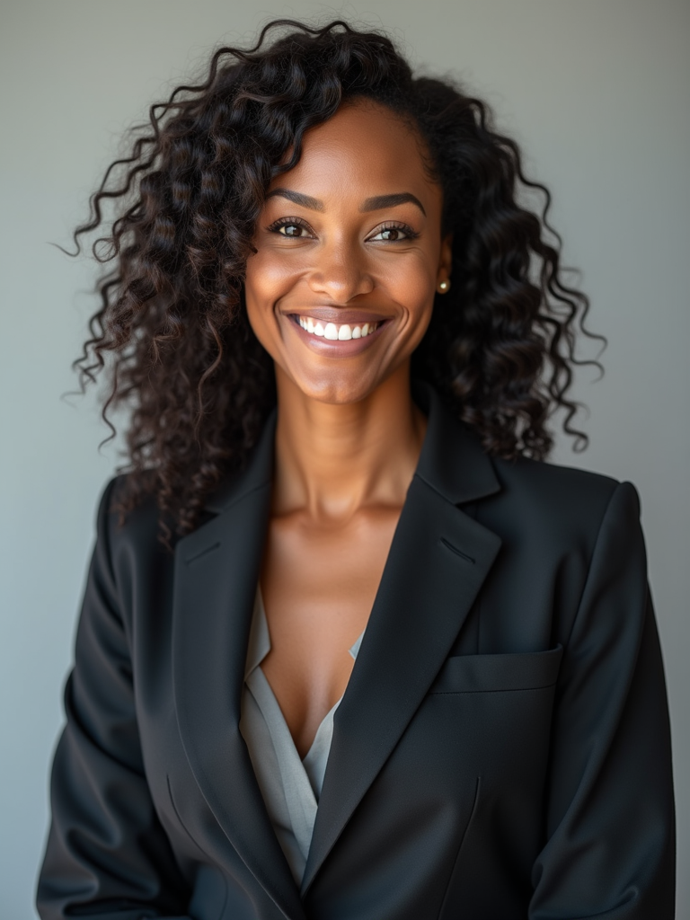 A professional real estate agent headshot of a confident model, taken in a well-lit studio with a plain backdrop. The model is dressed in a tailored blazer with a crisp blouse and a welcoming smile . The lighting is soft and even, highlighting their facial features with a professional and approachable expression. The focus is sharp, capturing the model's eyes and engaging smile, creating a perfect headshot for real estate listings and professional profiles.