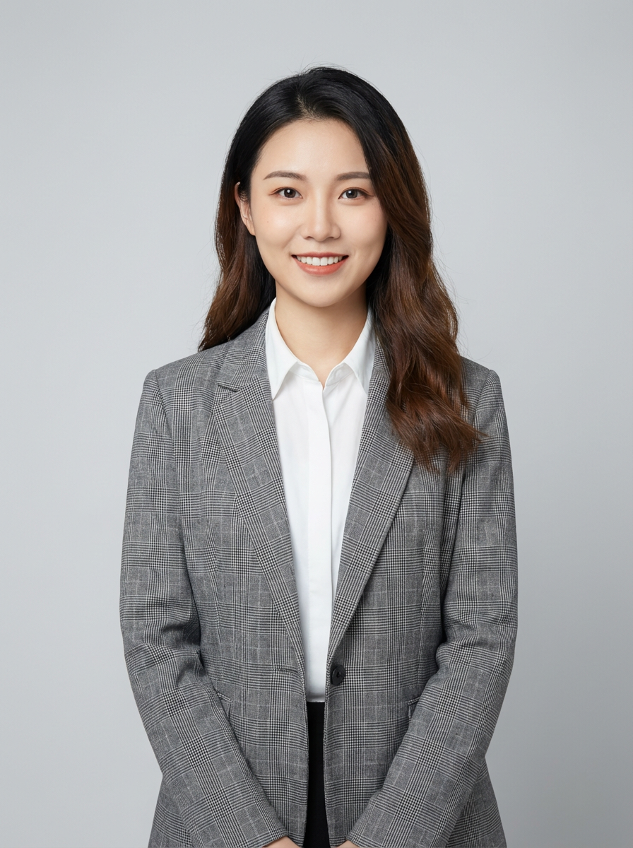 A professional real estate agent headshot of a confident model, taken in a well-lit studio with a plain backdrop. The model is dressed in a tailored blazer with a crisp blouse and a welcoming smile . The lighting is soft and even, highlighting their facial features with a professional and approachable expression. The focus is sharp, capturing the model's eyes and engaging smile, creating a perfect headshot for real estate listings and professional profiles.