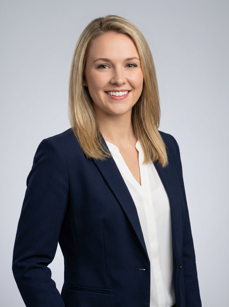 A professional real estate agent headshot of a confident model, taken in a well-lit studio with a plain backdrop. The model is dressed in a tailored blazer with a crisp blouse and a welcoming smile . The lighting is soft and even, highlighting their facial features with a professional and approachable expression. The focus is sharp, capturing the model's eyes and engaging smile, creating a perfect headshot for real estate listings and professional profiles.