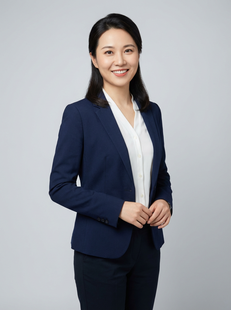 A professional real estate agent headshot of a confident model, taken in a well-lit studio with a plain backdrop. The model is dressed in a tailored blazer with a crisp blouse and a welcoming smile . The lighting is soft and even, highlighting their facial features with a professional and approachable expression. The focus is sharp, capturing the model's eyes and engaging smile, creating a perfect headshot for real estate listings and professional profiles.