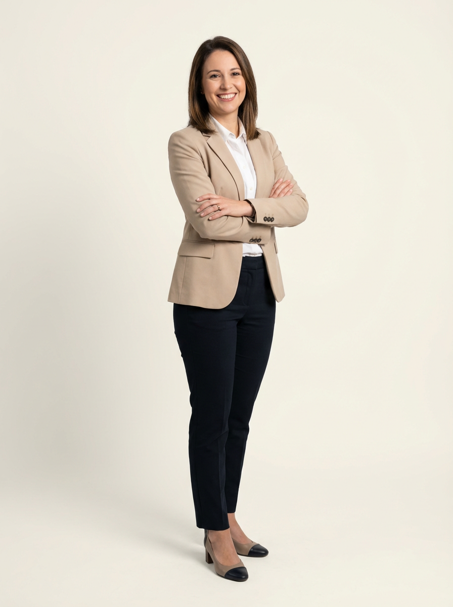 A professional real estate agent headshot of a confident model, taken in a well-lit studio with a plain backdrop. The model is dressed in a tailored blazer with a crisp blouse and a welcoming smile . The lighting is soft and even, highlighting their facial features with a professional and approachable expression. The focus is sharp, capturing the model's eyes and engaging smile, creating a perfect headshot for real estate listings and professional profiles.