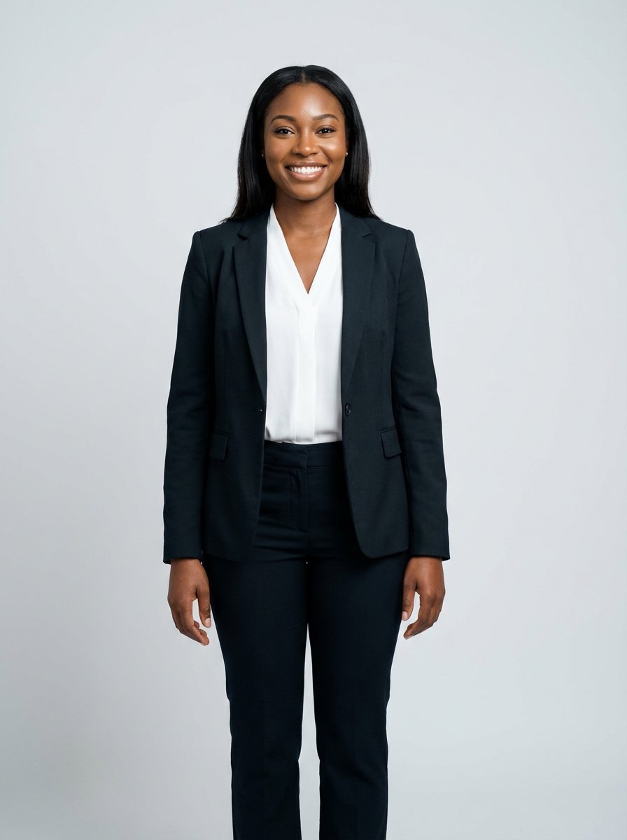 A professional real estate agent headshot of a confident model, taken in a well-lit studio with a plain backdrop. The model is dressed in a tailored blazer with a crisp blouse and a welcoming smile . The lighting is soft and even, highlighting their facial features with a professional and approachable expression. The focus is sharp, capturing the model's eyes and engaging smile, creating a perfect headshot for real estate listings and professional profiles.