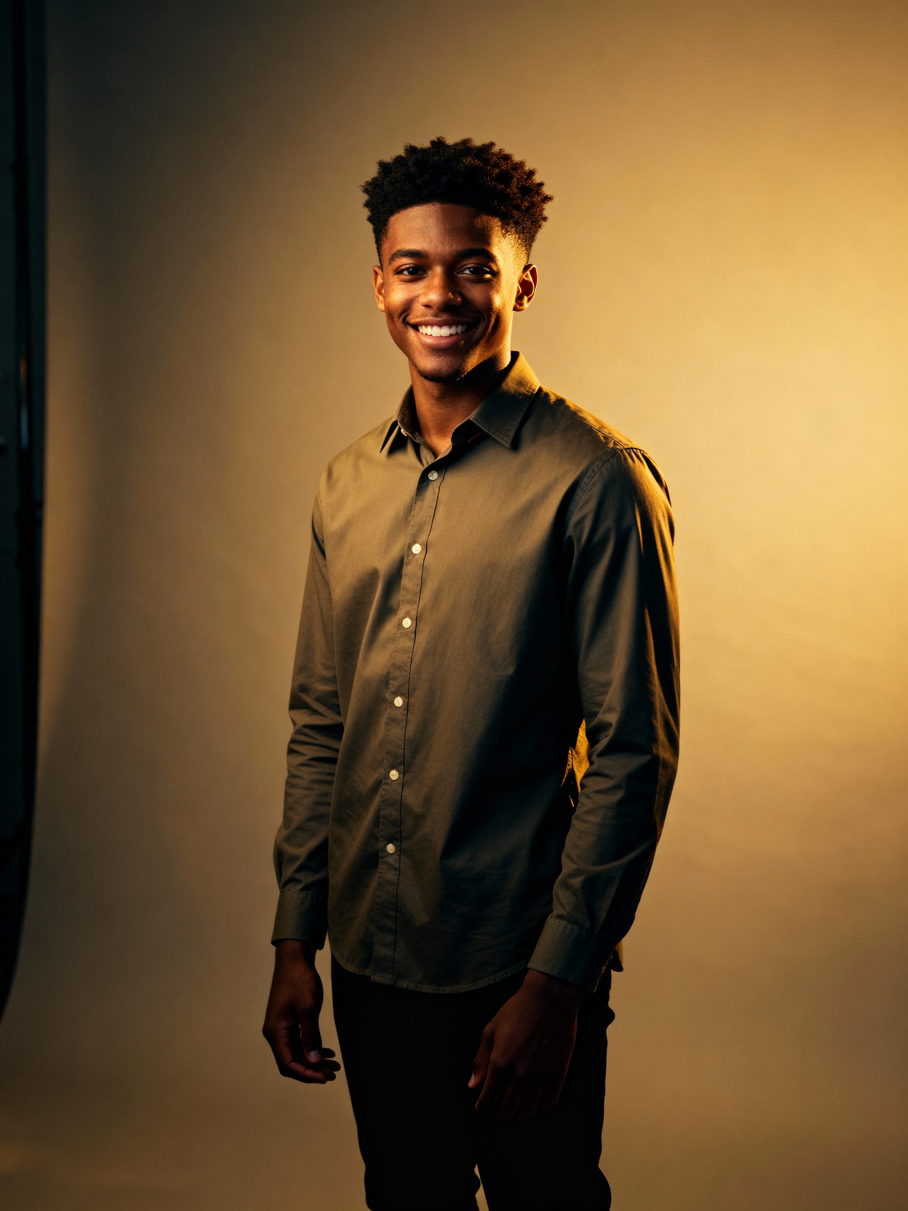 A professional teacher headshot of a friendly model, taken in a well-lit studio with a plain backdrop. The model is dressed in a neat, collared shirt with a welcoming expression. The lighting is soft and even, highlighting their facial features with an approachable and kind expression. The focus is sharp, capturing the model's eyes and genuine smile, creating a perfect headshot for school websites and professional profiles.