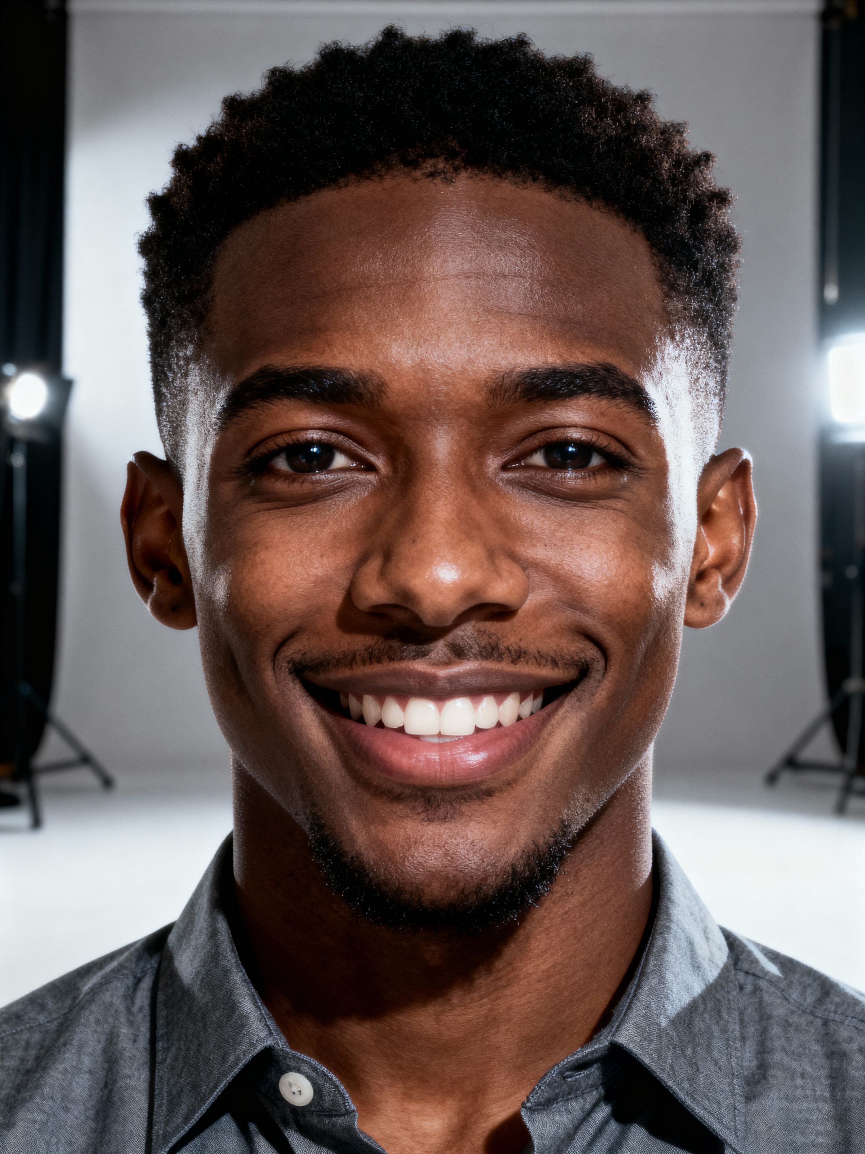 A professional teacher headshot of a friendly model, taken in a well-lit studio with a plain backdrop. The model is dressed in a neat, collared shirt with a welcoming expression. The lighting is soft and even, highlighting their facial features with an approachable and kind expression. The focus is sharp, capturing the model's eyes and genuine smile, creating a perfect headshot for school websites and professional profiles.