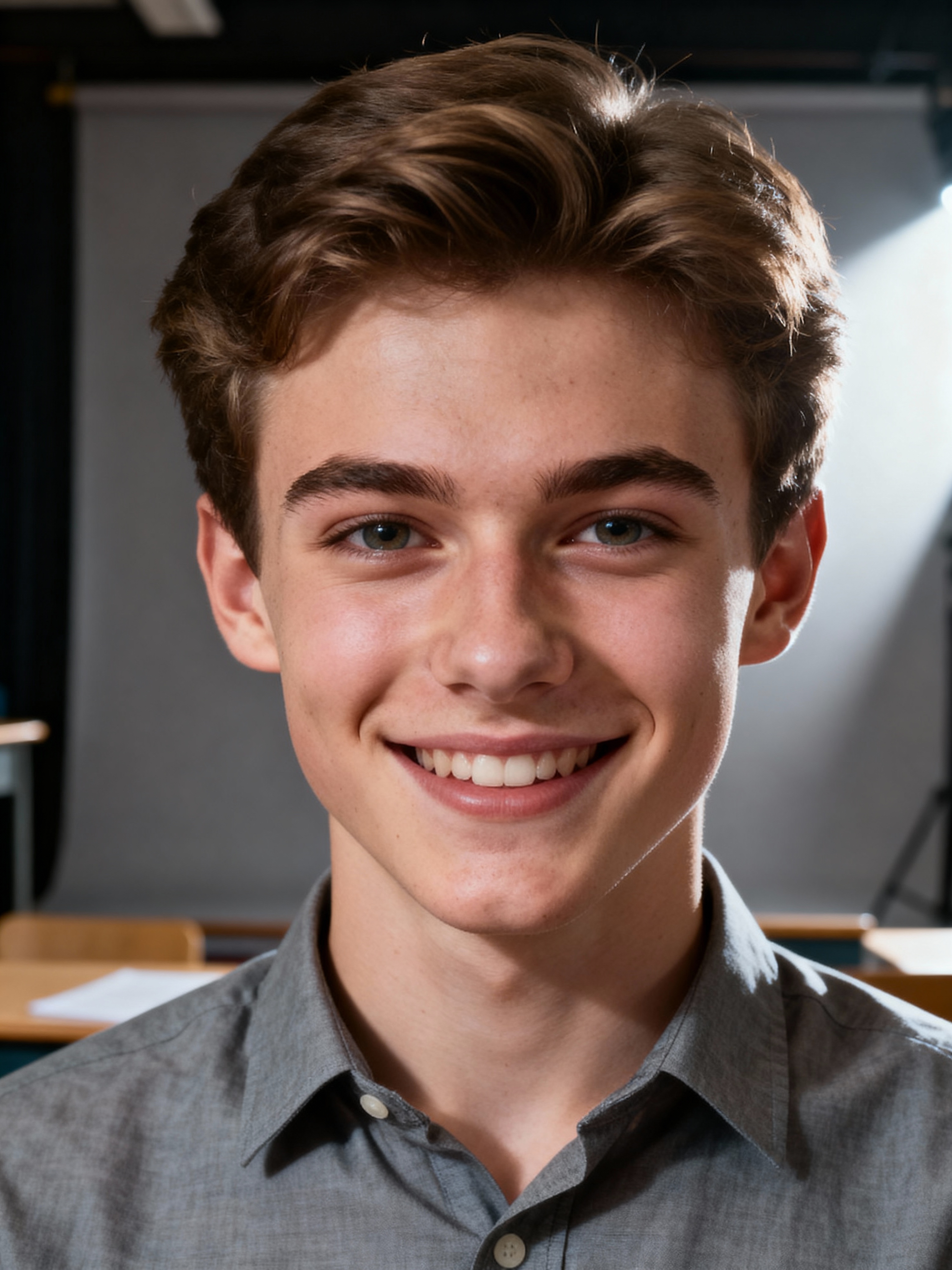 A professional teacher headshot of a friendly model, taken in a well-lit studio with a plain backdrop. The model is dressed in a neat, collared shirt with a welcoming expression. The lighting is soft and even, highlighting their facial features with an approachable and kind expression. The focus is sharp, capturing the model's eyes and genuine smile, creating a perfect headshot for school websites and professional profiles.