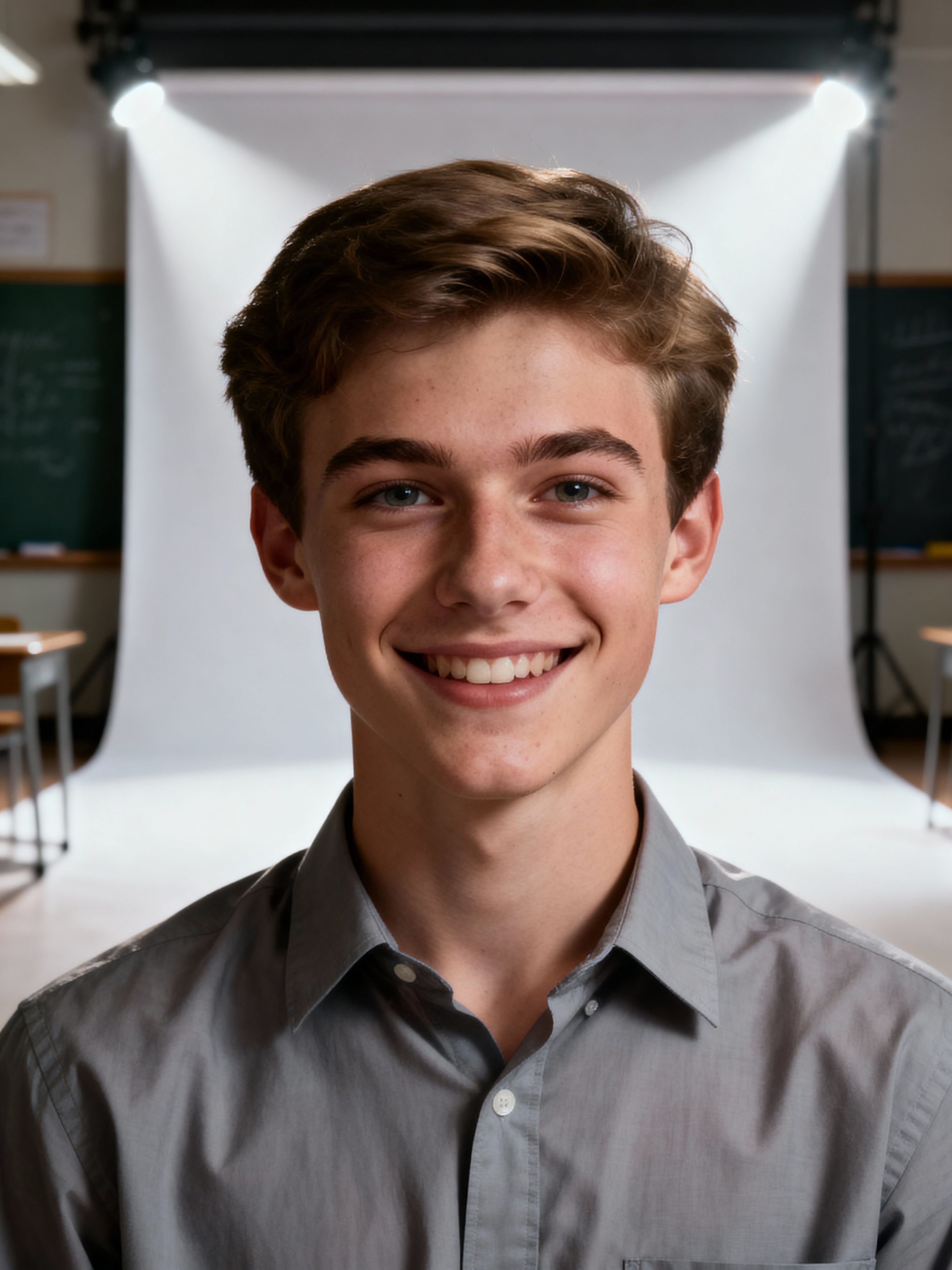 A professional teacher headshot of a friendly model, taken in a well-lit studio with a plain backdrop. The model is dressed in a neat, collared shirt with a welcoming expression. The lighting is soft and even, highlighting their facial features with an approachable and kind expression. The focus is sharp, capturing the model's eyes and genuine smile, creating a perfect headshot for school websites and professional profiles.