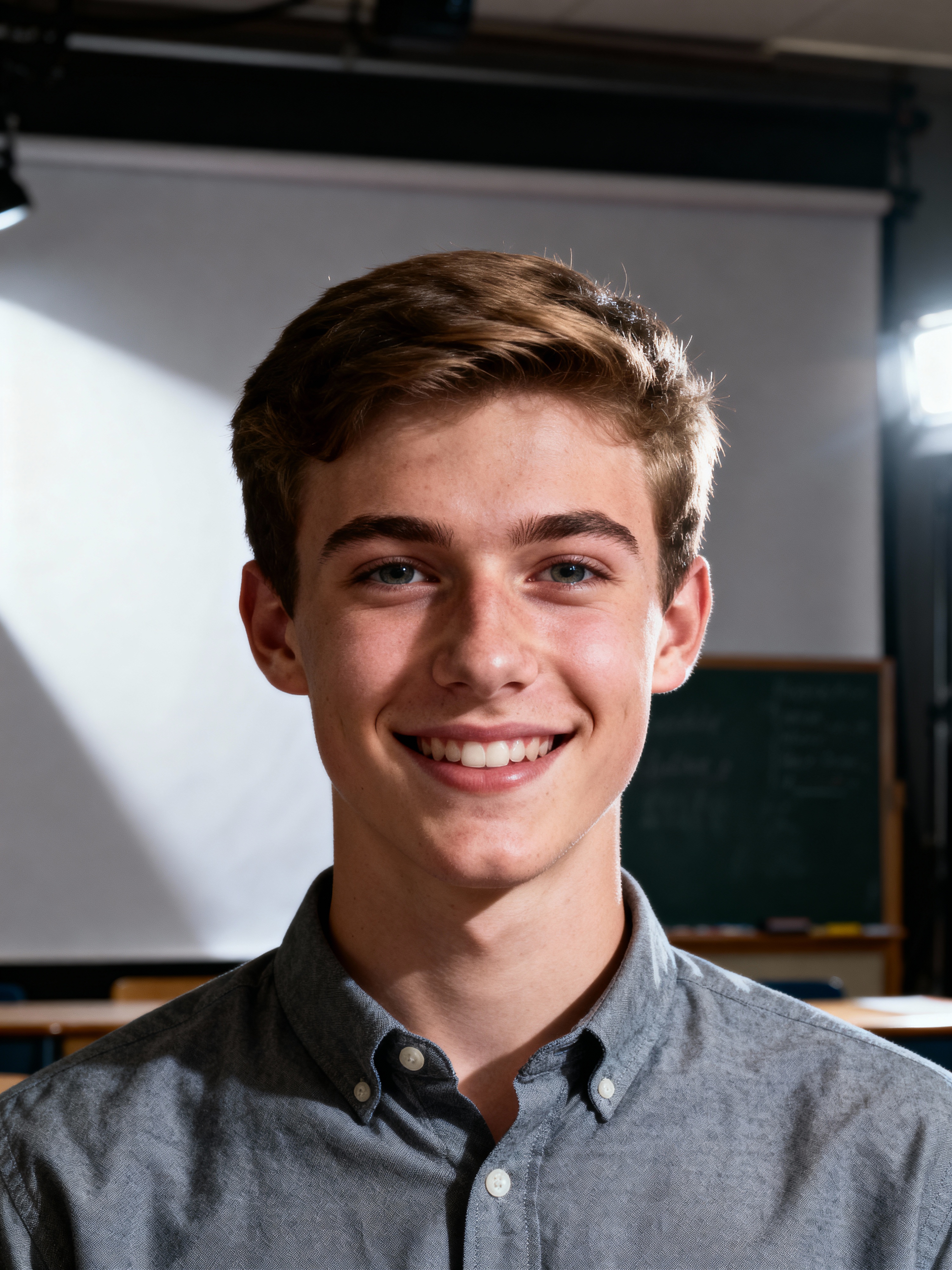 A professional teacher headshot of a friendly model, taken in a well-lit studio with a plain backdrop. The model is dressed in a neat, collared shirt with a welcoming expression. The lighting is soft and even, highlighting their facial features with an approachable and kind expression. The focus is sharp, capturing the model's eyes and genuine smile, creating a perfect headshot for school websites and professional profiles.