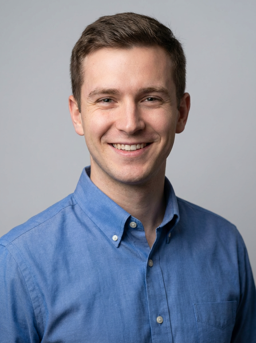 A professional teacher headshot of a friendly model, taken in a well-lit studio with a plain backdrop. The model is dressed in a neat, collared shirt with a welcoming expression. The lighting is soft and even, highlighting their facial features with an approachable and kind expression. The focus is sharp, capturing the model's eyes and genuine smile, creating a perfect headshot for school websites and professional profiles.