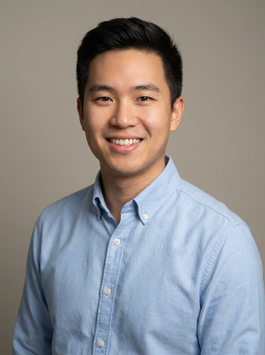 A professional teacher headshot of a friendly model, taken in a well-lit studio with a plain backdrop. The model is dressed in a neat, collared shirt with a welcoming expression. The lighting is soft and even, highlighting their facial features with an approachable and kind expression. The focus is sharp, capturing the model's eyes and genuine smile, creating a perfect headshot for school websites and professional profiles.