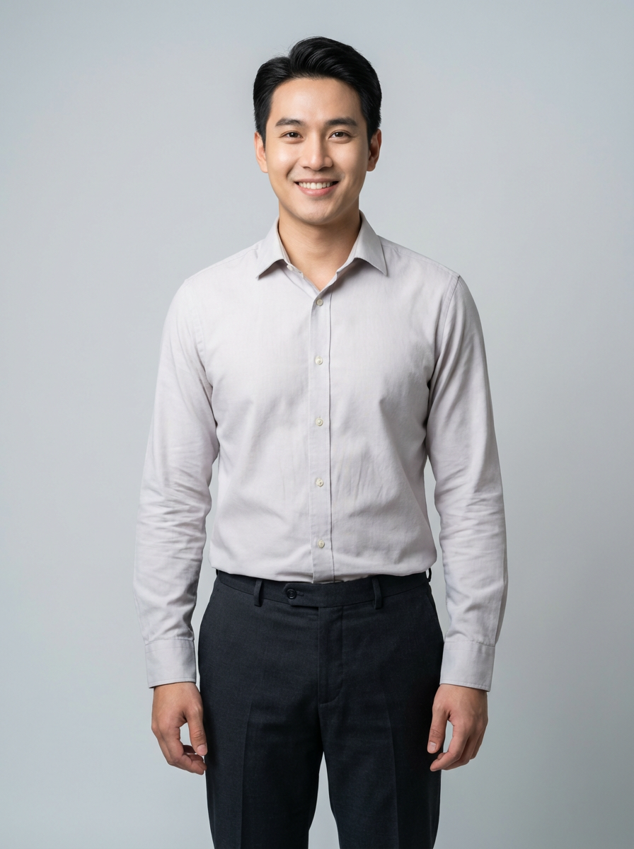 A professional teacher headshot of a friendly model, taken in a well-lit studio with a plain backdrop. The model is dressed in a neat, collared shirt with a welcoming expression. The lighting is soft and even, highlighting their facial features with an approachable and kind expression. The focus is sharp, capturing the model's eyes and genuine smile, creating a perfect headshot for school websites and professional profiles.