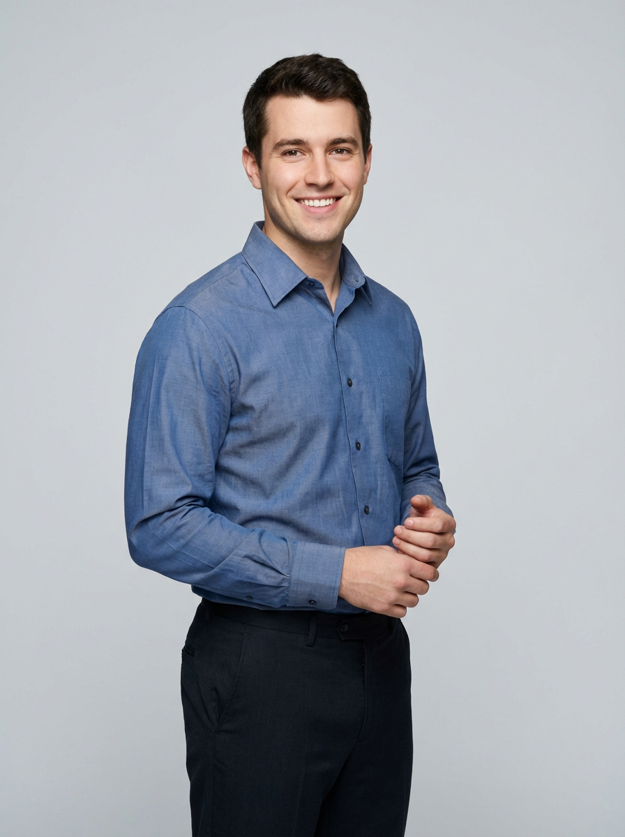 A professional teacher headshot of a friendly model, taken in a well-lit studio with a plain backdrop. The model is dressed in a neat, collared shirt with a welcoming expression. The lighting is soft and even, highlighting their facial features with an approachable and kind expression. The focus is sharp, capturing the model's eyes and genuine smile, creating a perfect headshot for school websites and professional profiles.