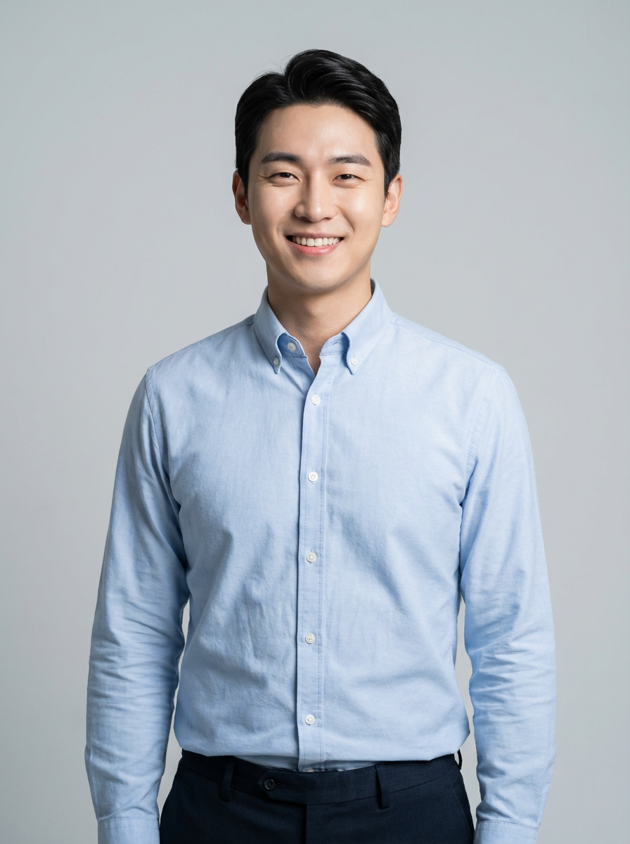 A professional teacher headshot of a friendly model, taken in a well-lit studio with a plain backdrop. The model is dressed in a neat, collared shirt with a welcoming expression. The lighting is soft and even, highlighting their facial features with an approachable and kind expression. The focus is sharp, capturing the model's eyes and genuine smile, creating a perfect headshot for school websites and professional profiles.
