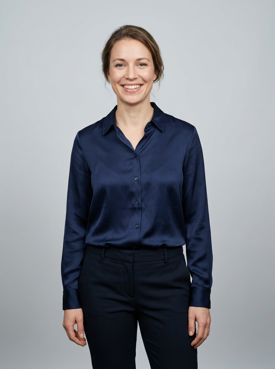 A professional teacher headshot of a friendly model, taken in a well-lit studio with a plain backdrop. The model is dressed in a smart, professional blouse with natural makeup and a warm smile . The lighting is soft and even, highlighting their facial features with an approachable and kind expression. The focus is sharp, capturing the model's eyes and genuine smile, creating a perfect headshot for school websites and professional profiles.