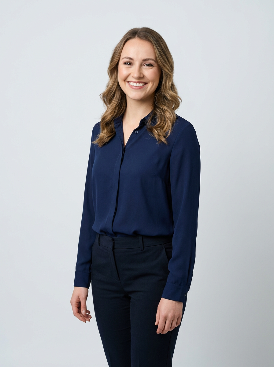 A professional teacher headshot of a friendly model, taken in a well-lit studio with a plain backdrop. The model is dressed in a smart, professional blouse with natural makeup and a warm smile . The lighting is soft and even, highlighting their facial features with an approachable and kind expression. The focus is sharp, capturing the model's eyes and genuine smile, creating a perfect headshot for school websites and professional profiles.