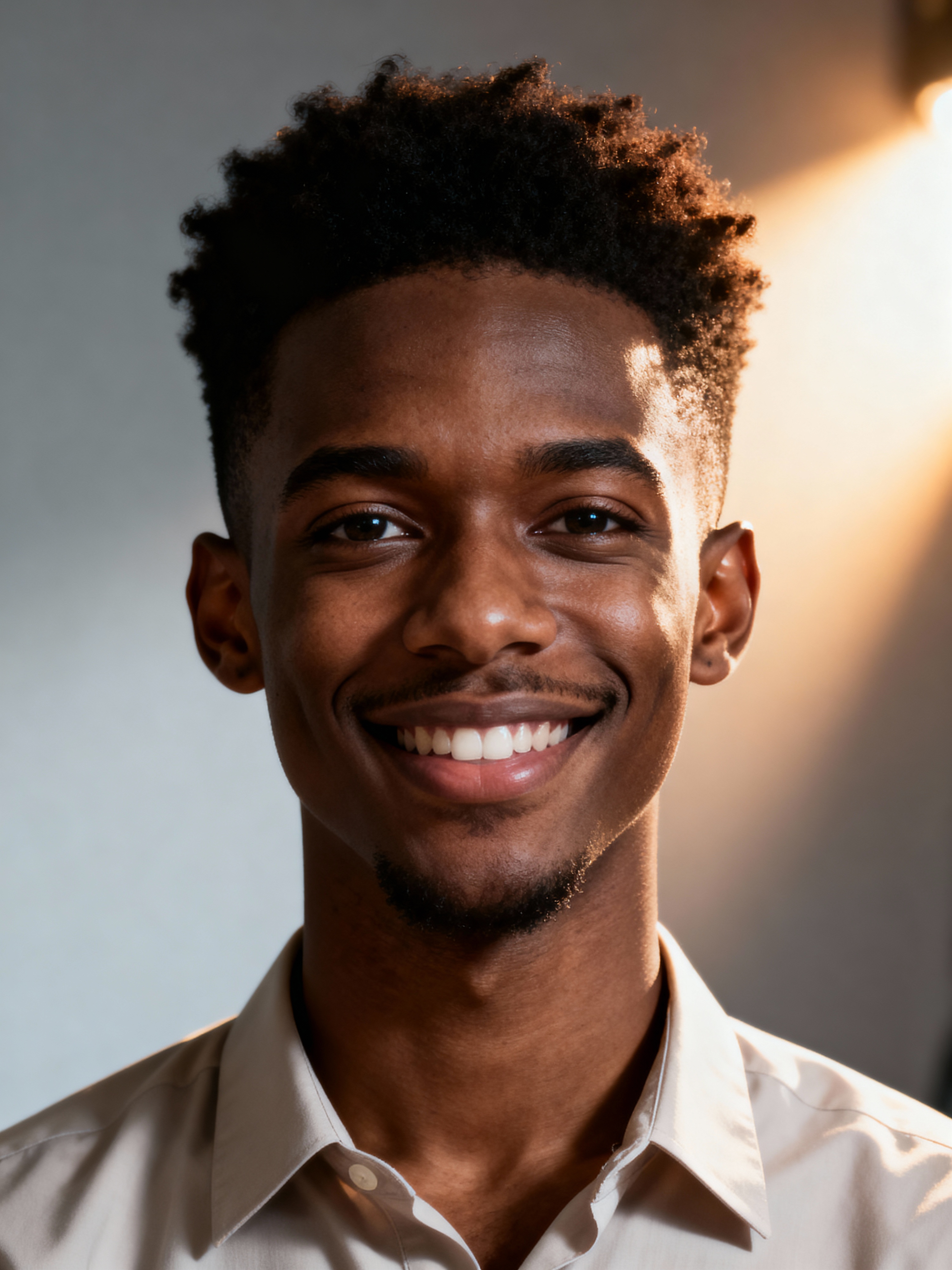 A professional therapist headshot of a compassionate model, taken in a well-lit studio with a plain backdrop. The model is dressed in a neat, light-colored shirt with a friendly expression. The lighting is soft and even, highlighting their facial features with a warm and approachable expression. The focus is sharp, capturing the model's eyes and reassuring smile, creating a perfect headshot for therapy practices and professional profiles.