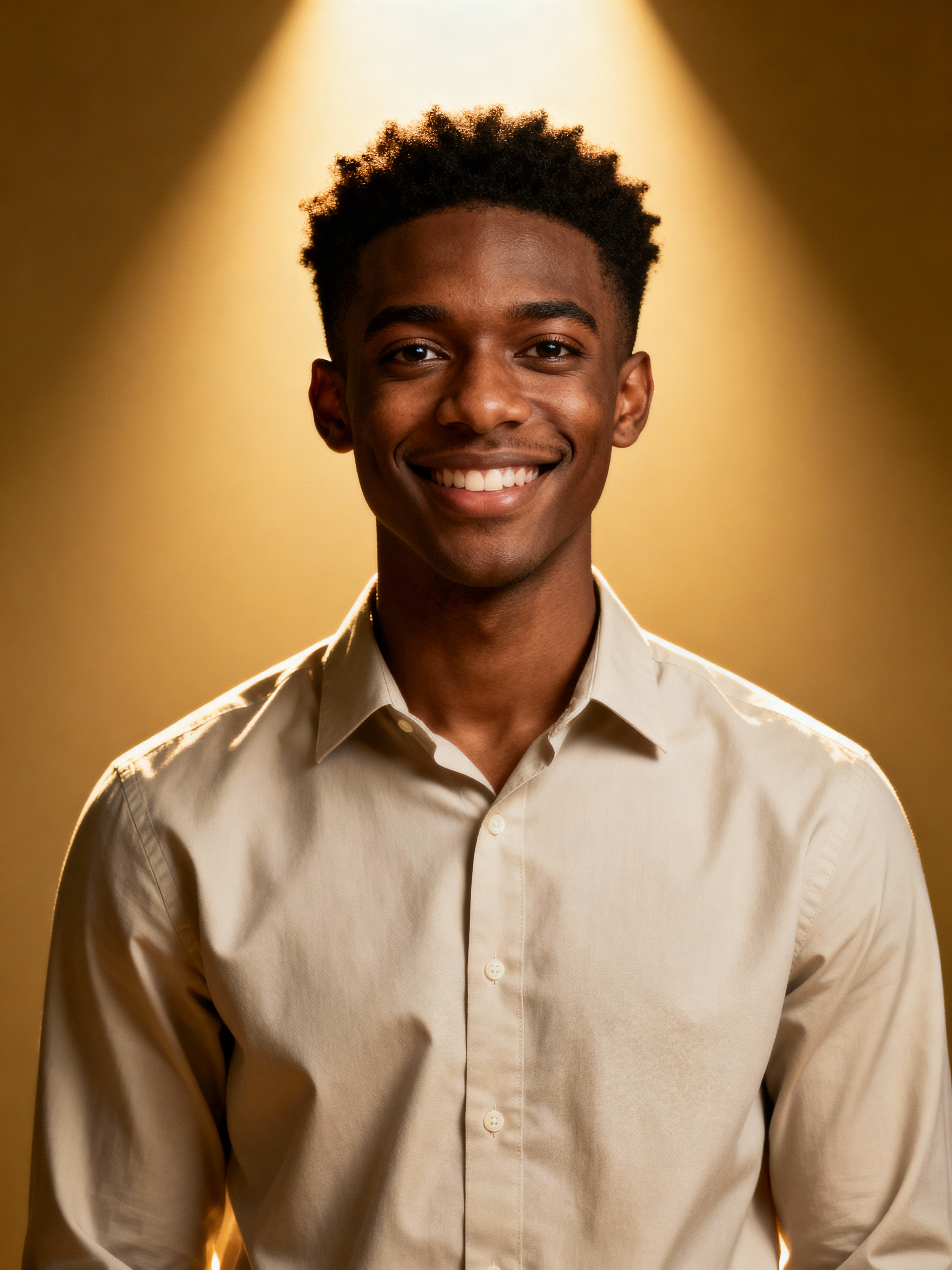 A professional therapist headshot of a compassionate model, taken in a well-lit studio with a plain backdrop. The model is dressed in a neat, light-colored shirt with a friendly expression. The lighting is soft and even, highlighting their facial features with a warm and approachable expression. The focus is sharp, capturing the model's eyes and reassuring smile, creating a perfect headshot for therapy practices and professional profiles.