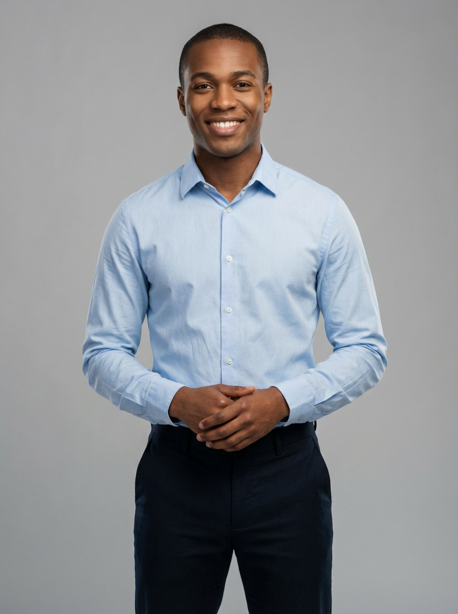 A professional therapist headshot of a compassionate model, taken in a well-lit studio with a plain backdrop. The model is dressed in a neat, light-colored shirt with a friendly expression. The lighting is soft and even, highlighting their facial features with a warm and approachable expression. The focus is sharp, capturing the model's eyes and reassuring smile, creating a perfect headshot for therapy practices and professional profiles.
