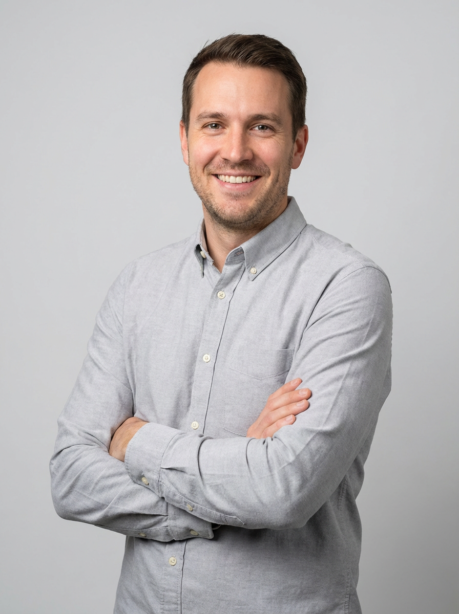 A professional therapist headshot of a compassionate model, taken in a well-lit studio with a plain backdrop. The model is dressed in a neat, light-colored shirt with a friendly expression. The lighting is soft and even, highlighting their facial features with a warm and approachable expression. The focus is sharp, capturing the model's eyes and reassuring smile, creating a perfect headshot for therapy practices and professional profiles.