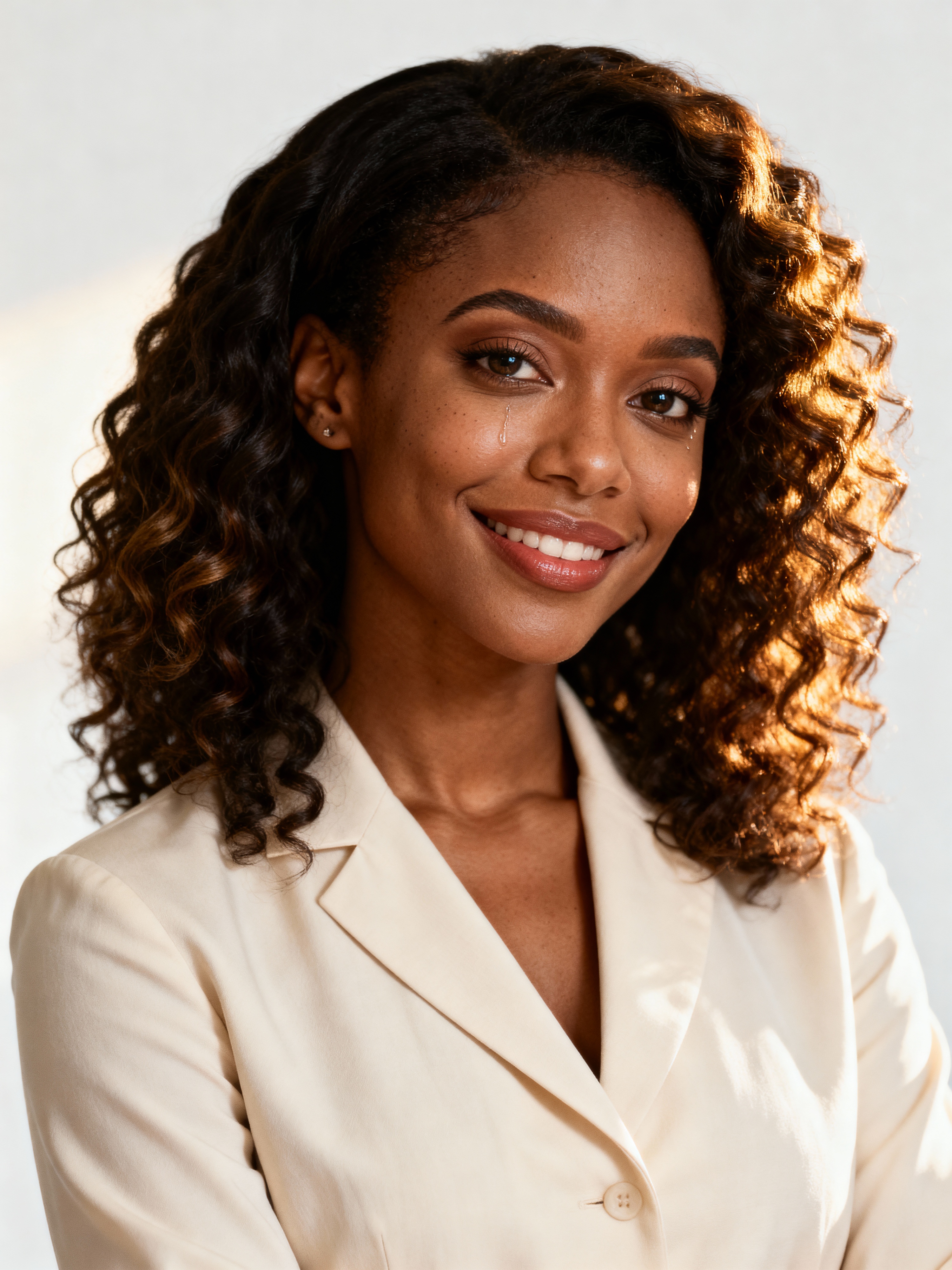 A professional therapist headshot of a compassionate model, taken in a well-lit studio with a plain backdrop. The model is dressed in a soft, professional blouse with natural makeup and a gentle smile . The lighting is soft and even, highlighting their facial features with a warm and approachable expression. The focus is sharp, capturing the model's eyes and reassuring smile, creating a perfect headshot for therapy practices and professional profiles.