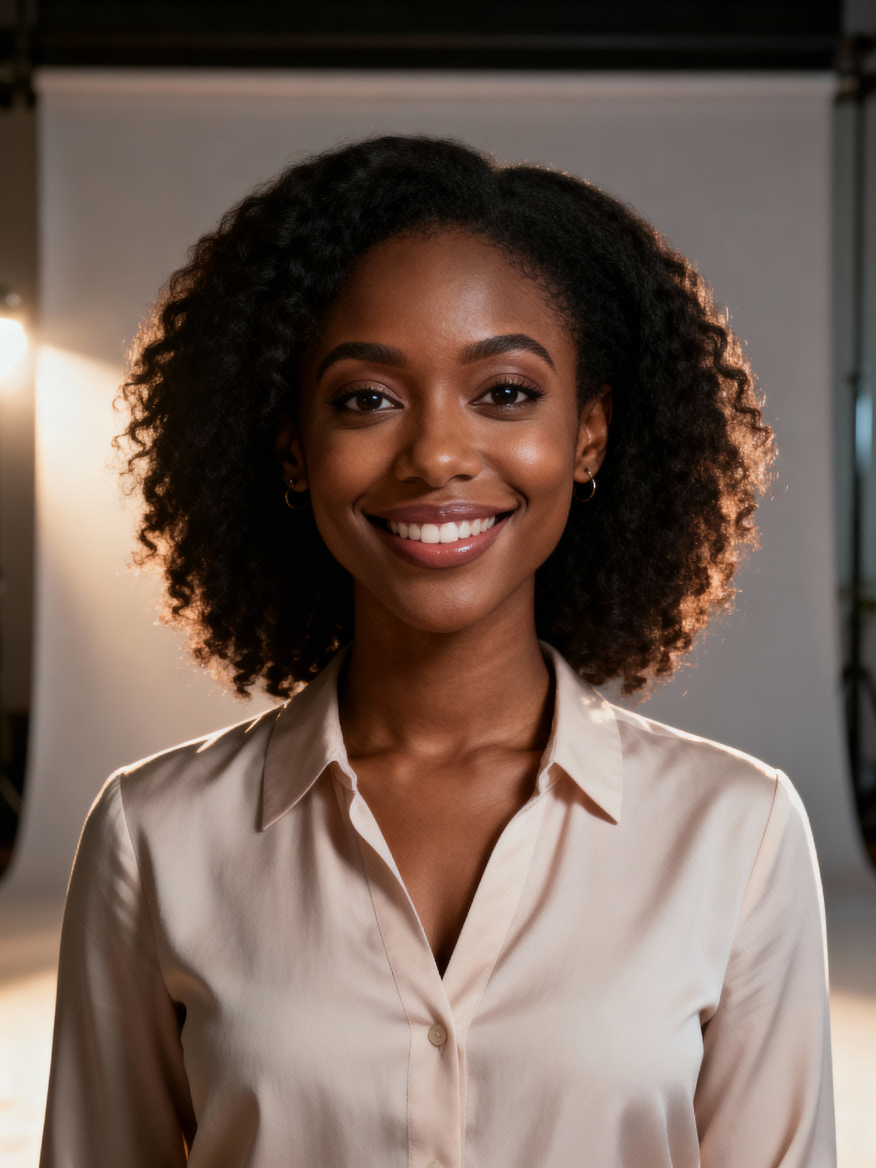 A professional therapist headshot of a compassionate model, taken in a well-lit studio with a plain backdrop. The model is dressed in a soft, professional blouse with natural makeup and a gentle smile . The lighting is soft and even, highlighting their facial features with a warm and approachable expression. The focus is sharp, capturing the model's eyes and reassuring smile, creating a perfect headshot for therapy practices and professional profiles.