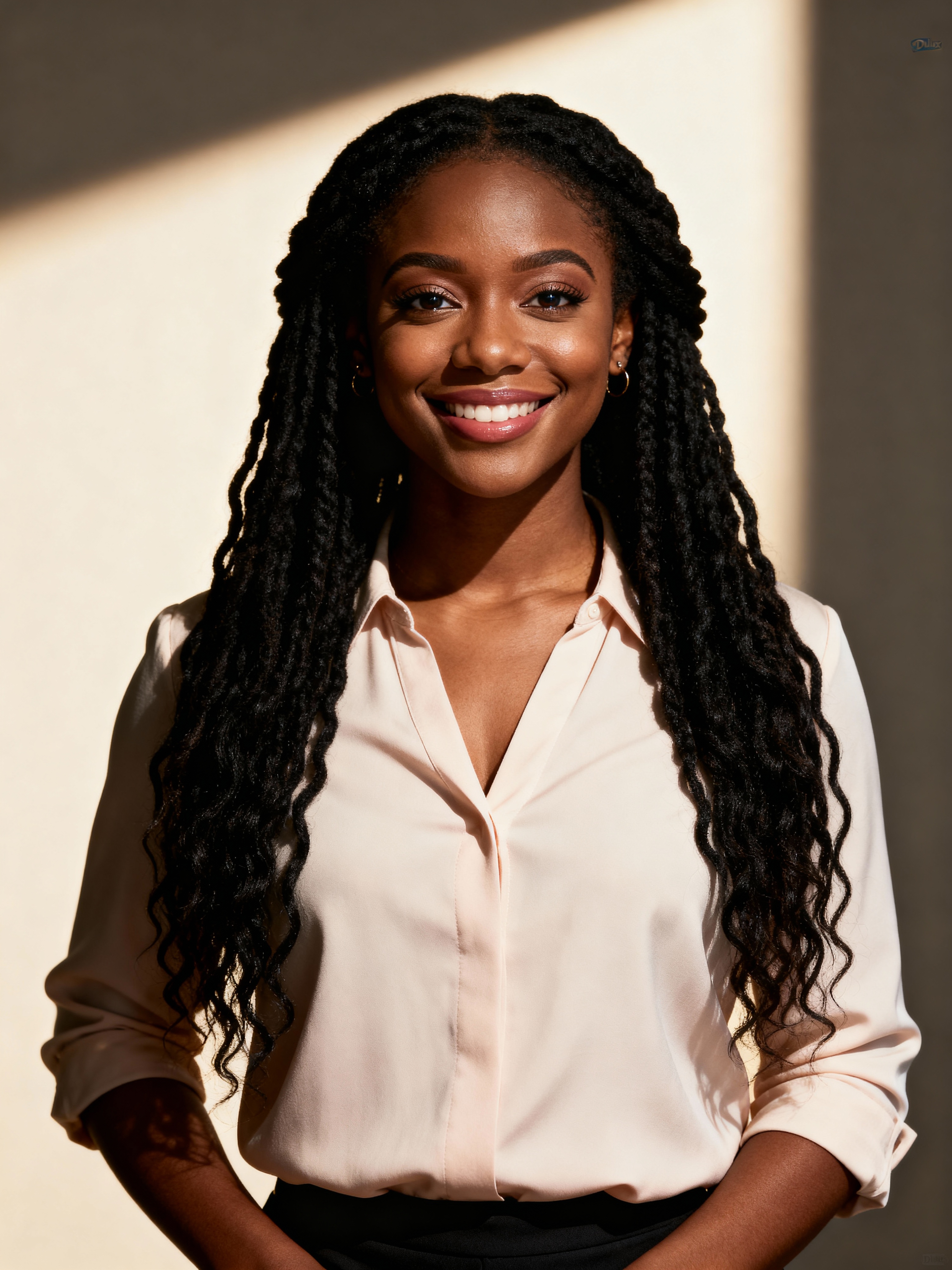A professional therapist headshot of a compassionate model, taken in a well-lit studio with a plain backdrop. The model is dressed in a soft, professional blouse with natural makeup and a gentle smile . The lighting is soft and even, highlighting their facial features with a warm and approachable expression. The focus is sharp, capturing the model's eyes and reassuring smile, creating a perfect headshot for therapy practices and professional profiles.