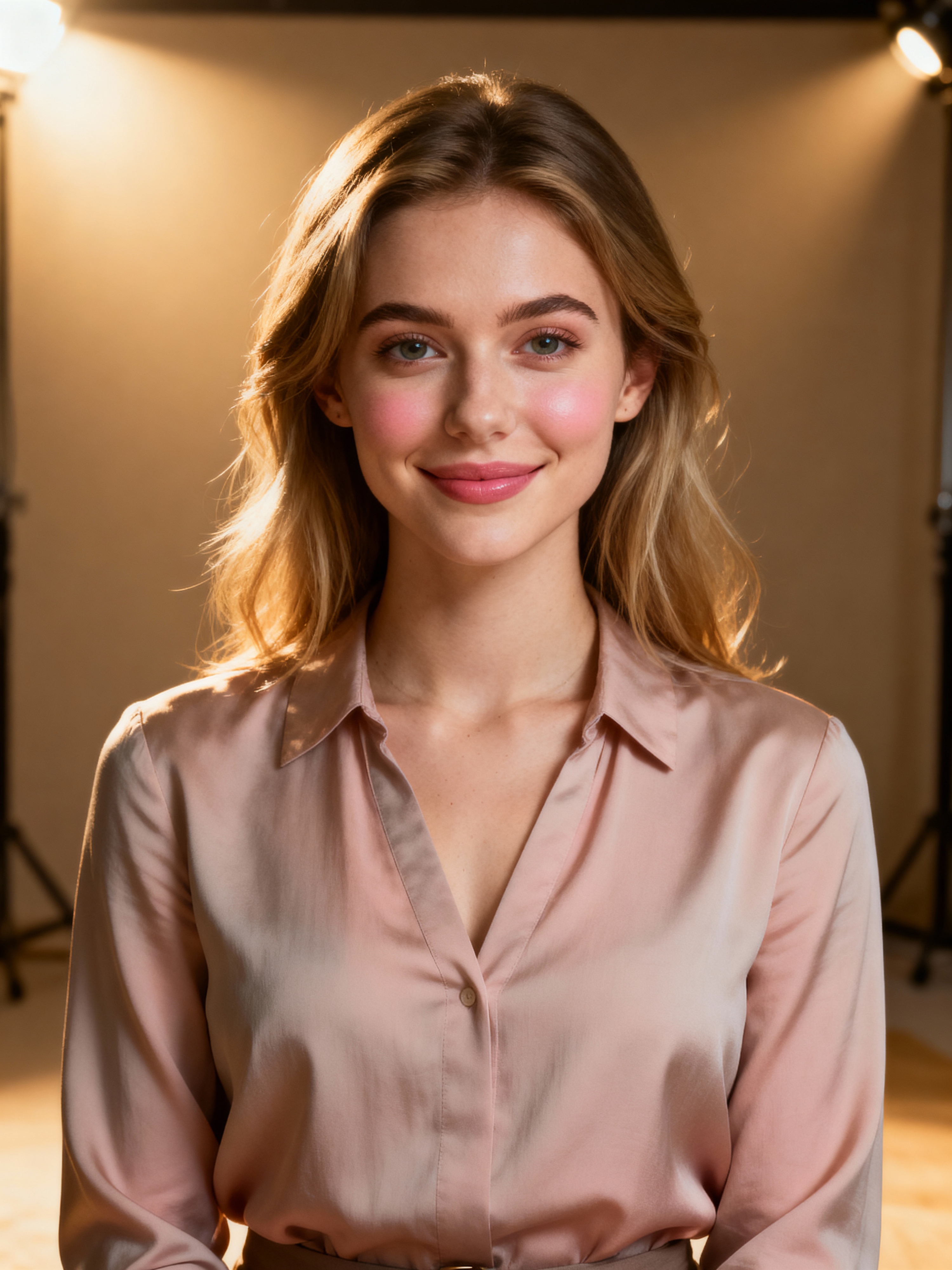 A professional therapist headshot of a compassionate model, taken in a well-lit studio with a plain backdrop. The model is dressed in a soft, professional blouse with natural makeup and a gentle smile . The lighting is soft and even, highlighting their facial features with a warm and approachable expression. The focus is sharp, capturing the model's eyes and reassuring smile, creating a perfect headshot for therapy practices and professional profiles.
