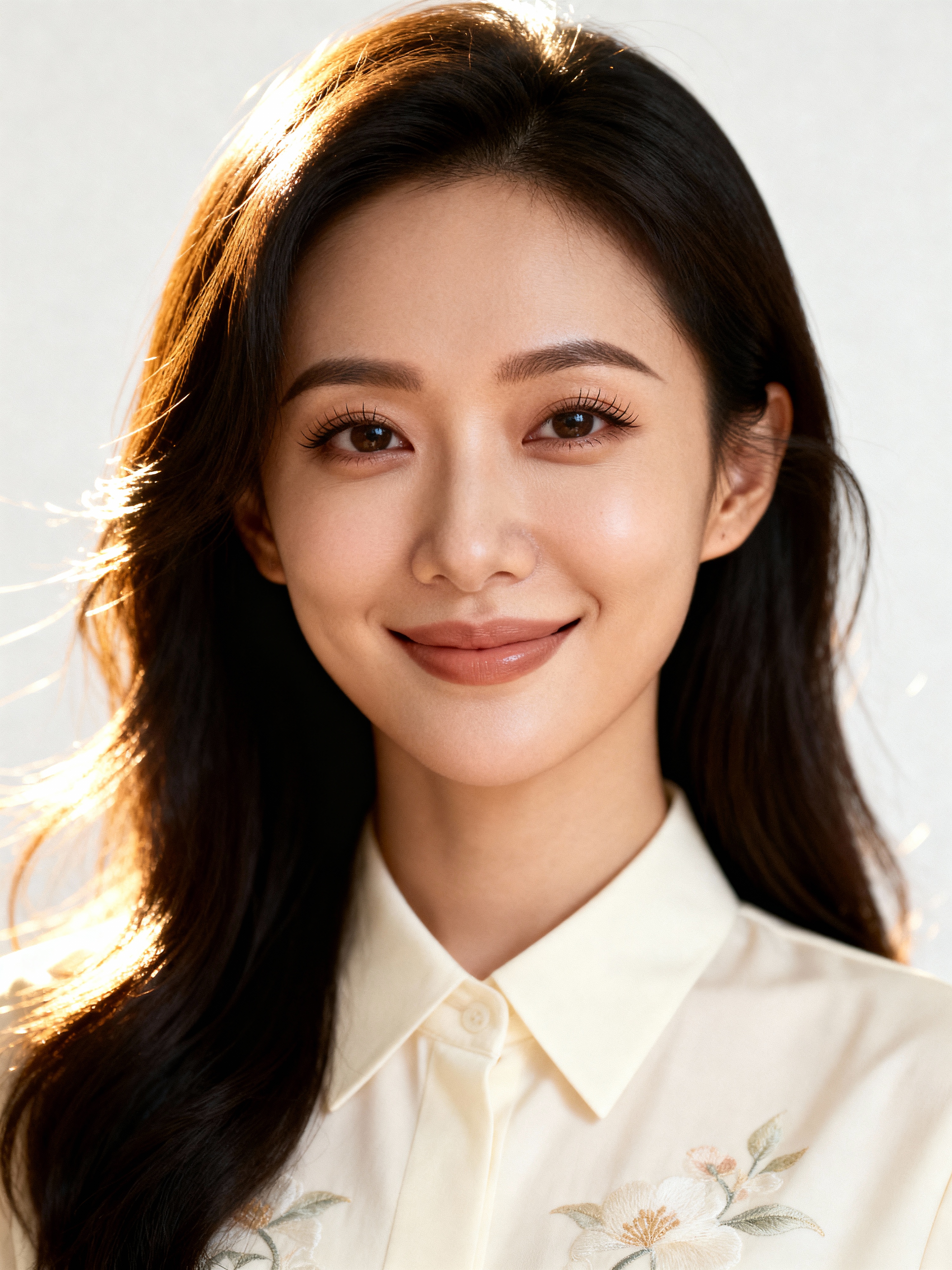 A professional therapist headshot of a compassionate model, taken in a well-lit studio with a plain backdrop. The model is dressed in a soft, professional blouse with natural makeup and a gentle smile . The lighting is soft and even, highlighting their facial features with a warm and approachable expression. The focus is sharp, capturing the model's eyes and reassuring smile, creating a perfect headshot for therapy practices and professional profiles.
