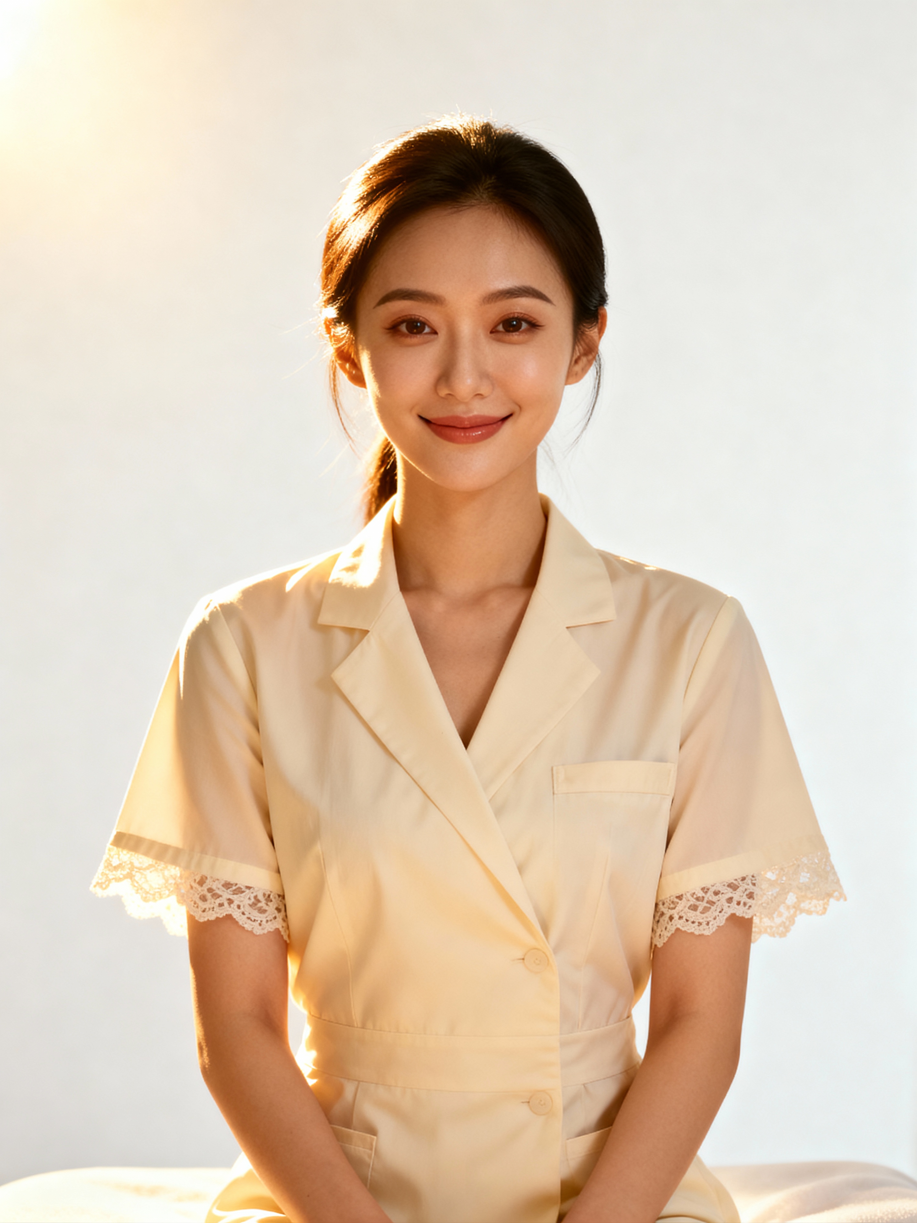 A professional therapist headshot of a compassionate model, taken in a well-lit studio with a plain backdrop. The model is dressed in a soft, professional blouse with natural makeup and a gentle smile . The lighting is soft and even, highlighting their facial features with a warm and approachable expression. The focus is sharp, capturing the model's eyes and reassuring smile, creating a perfect headshot for therapy practices and professional profiles.