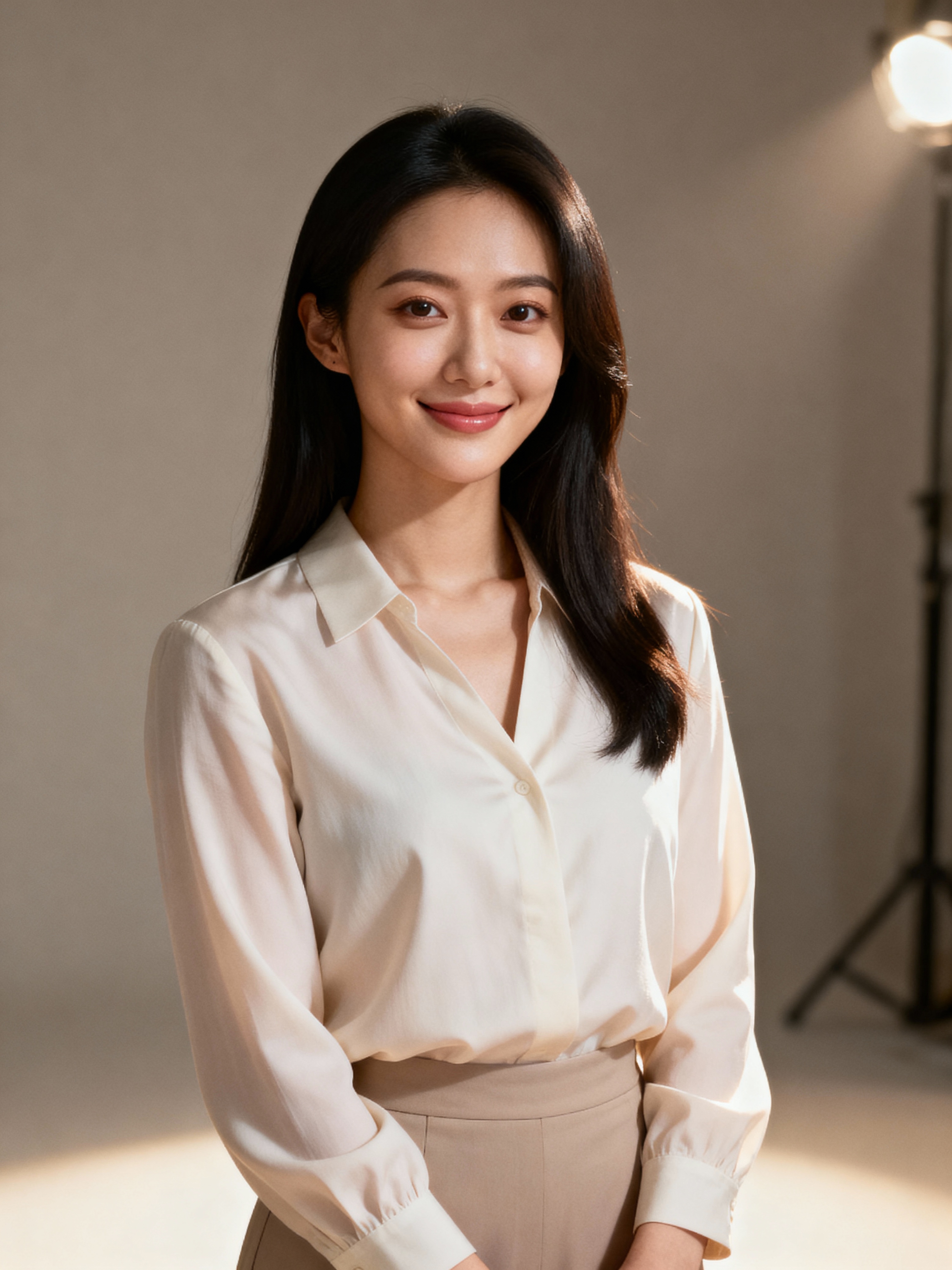 A professional therapist headshot of a compassionate model, taken in a well-lit studio with a plain backdrop. The model is dressed in a soft, professional blouse with natural makeup and a gentle smile . The lighting is soft and even, highlighting their facial features with a warm and approachable expression. The focus is sharp, capturing the model's eyes and reassuring smile, creating a perfect headshot for therapy practices and professional profiles.
