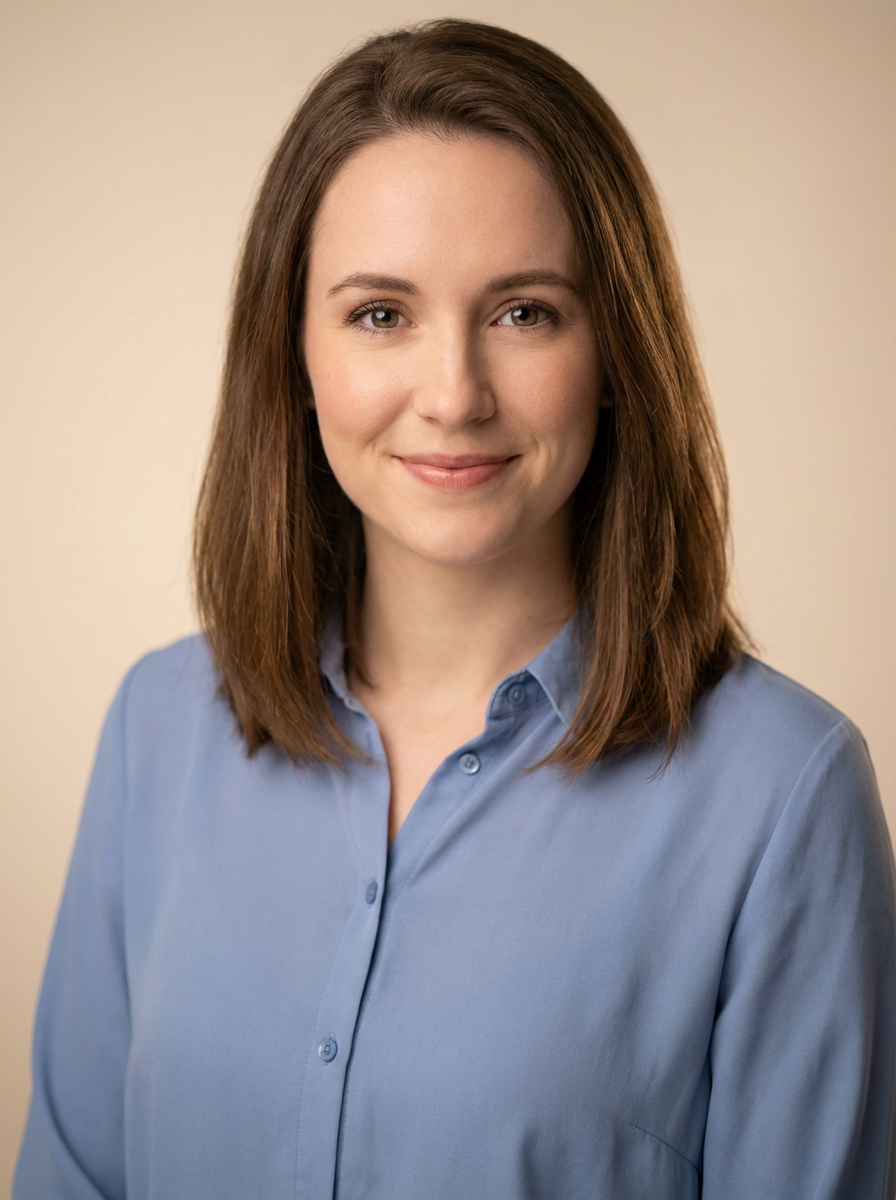 A professional therapist headshot of a compassionate model, taken in a well-lit studio with a plain backdrop. The model is dressed in a soft, professional blouse with natural makeup and a gentle smile . The lighting is soft and even, highlighting their facial features with a warm and approachable expression. The focus is sharp, capturing the model's eyes and reassuring smile, creating a perfect headshot for therapy practices and professional profiles.