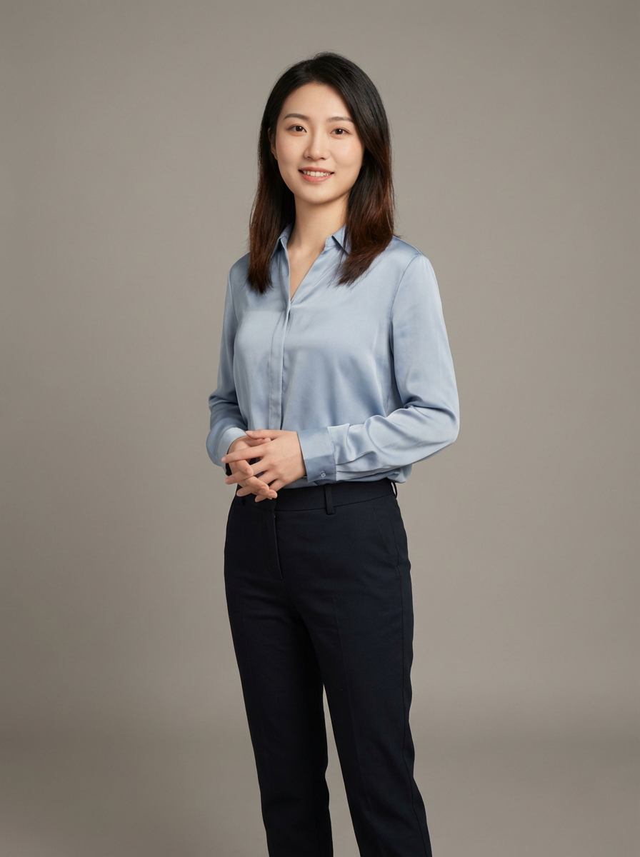 A professional therapist headshot of a compassionate model, taken in a well-lit studio with a plain backdrop. The model is dressed in a soft, professional blouse with natural makeup and a gentle smile . The lighting is soft and even, highlighting their facial features with a warm and approachable expression. The focus is sharp, capturing the model's eyes and reassuring smile, creating a perfect headshot for therapy practices and professional profiles.