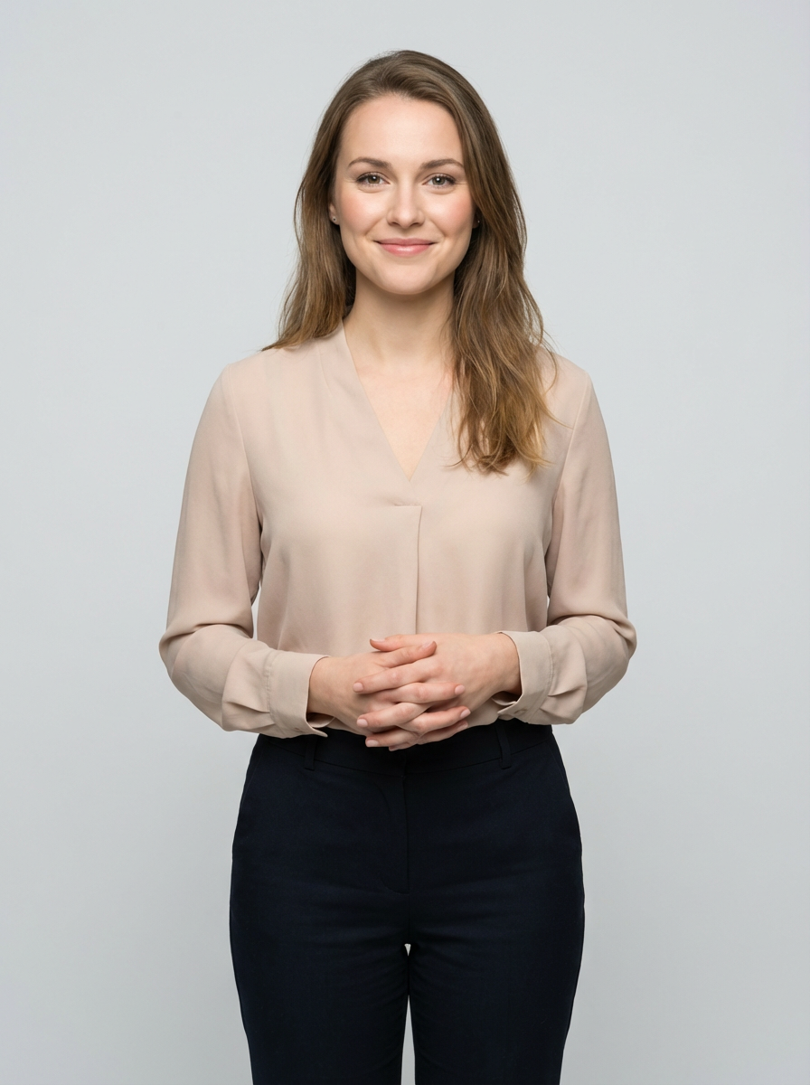 A professional therapist headshot of a compassionate model, taken in a well-lit studio with a plain backdrop. The model is dressed in a soft, professional blouse with natural makeup and a gentle smile . The lighting is soft and even, highlighting their facial features with a warm and approachable expression. The focus is sharp, capturing the model's eyes and reassuring smile, creating a perfect headshot for therapy practices and professional profiles.