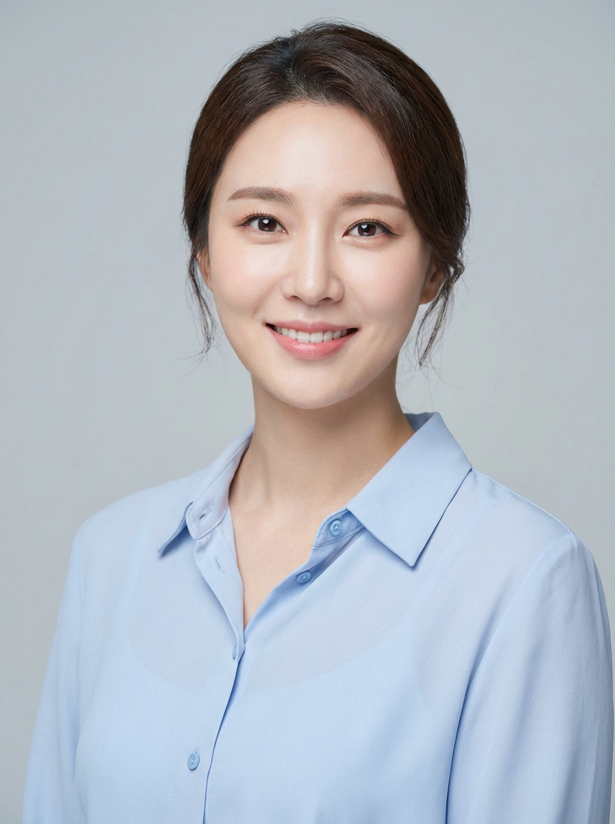 A professional therapist headshot of a compassionate model, taken in a well-lit studio with a plain backdrop. The model is dressed in a soft, professional blouse with natural makeup and a gentle smile . The lighting is soft and even, highlighting their facial features with a warm and approachable expression. The focus is sharp, capturing the model's eyes and reassuring smile, creating a perfect headshot for therapy practices and professional profiles.