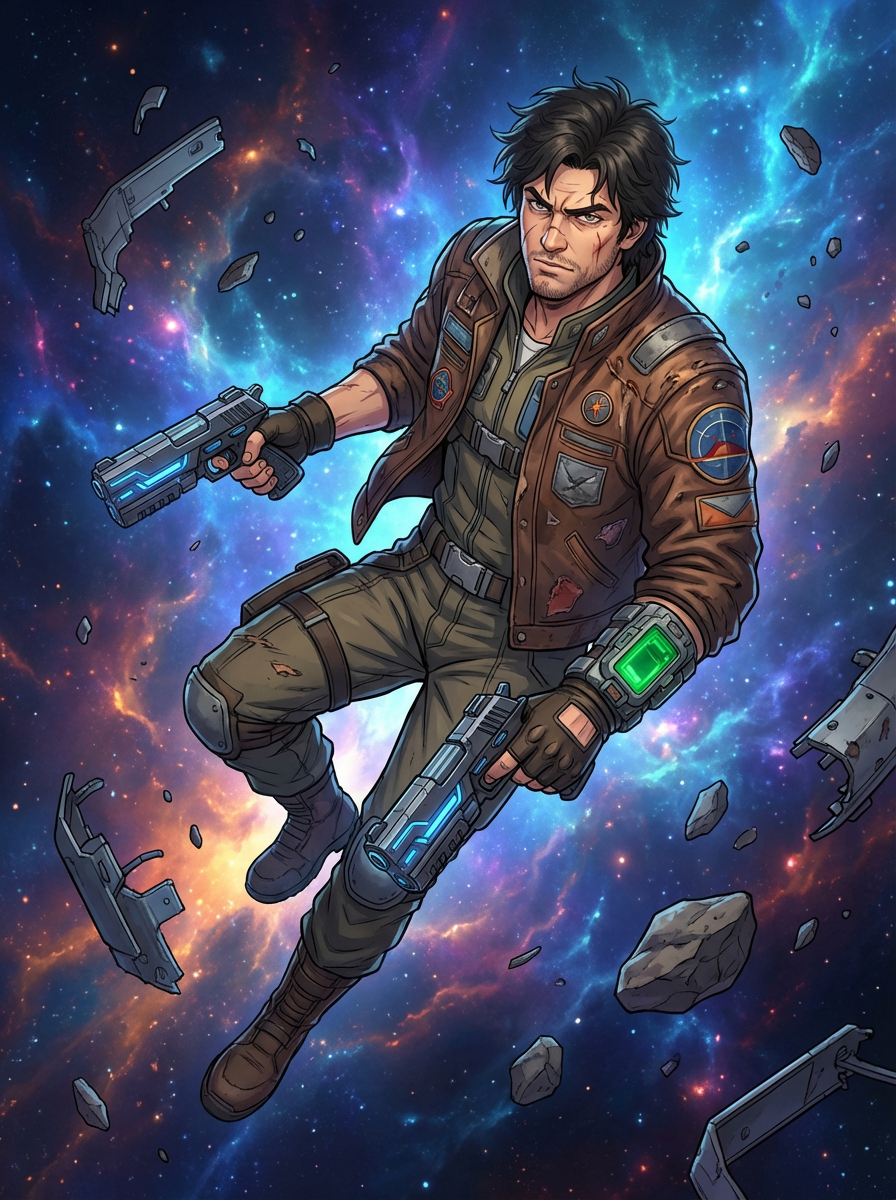 A rugged anime bounty hunter floating in zero gravity, wielding dual energy pistols. The character wears a worn-out but stylish space jacket with fingerless gloves and a bounty tracker on his wrist. The background is a vast cosmic nebula with space debris floating around. The style is in anime illustration.