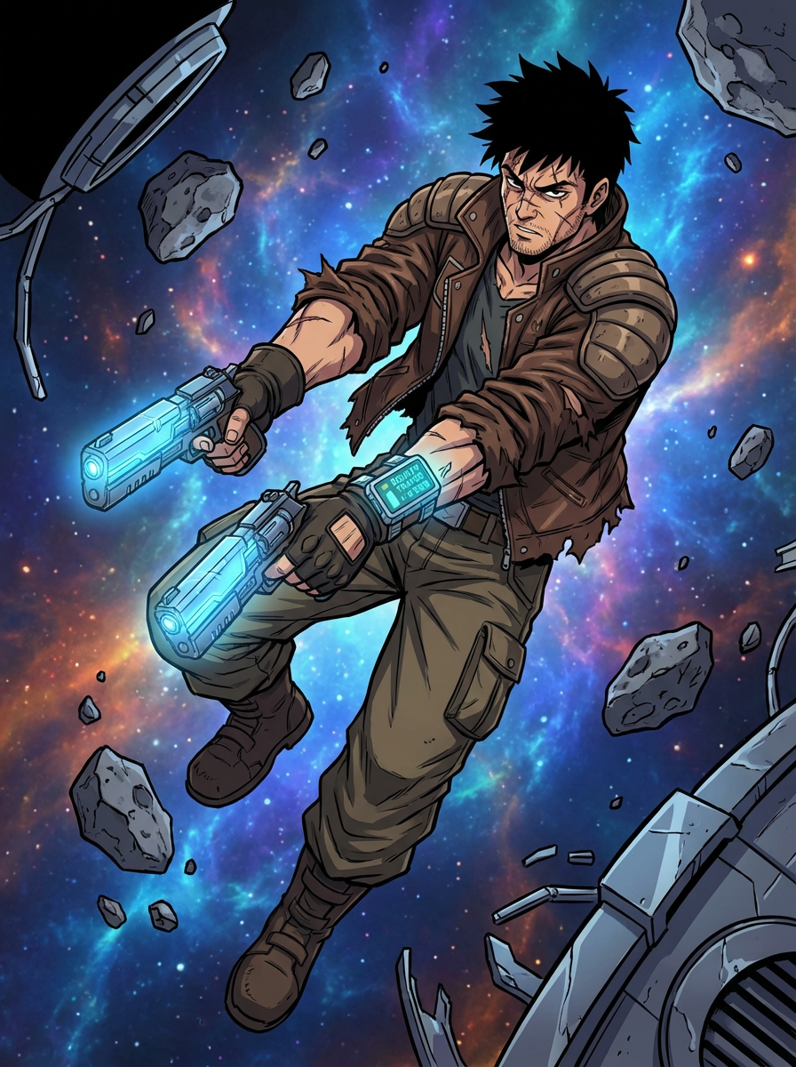 A rugged anime bounty hunter floating in zero gravity, wielding dual energy pistols. The character wears a worn-out but stylish space jacket with fingerless gloves and a bounty tracker on his wrist. The background is a vast cosmic nebula with space debris floating around. The style is in anime illustration.