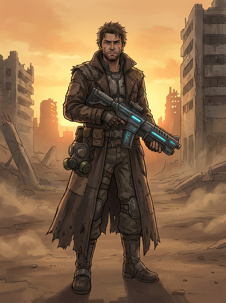 A rugged anime survivor in a desolate wasteland, gripping a futuristic rifle. The character wears a tattered long coat with a gas mask hanging from his belt. The background features crumbling buildings and a glowing orange sky, evoking a dystopian feel. The style is in anime illustration.