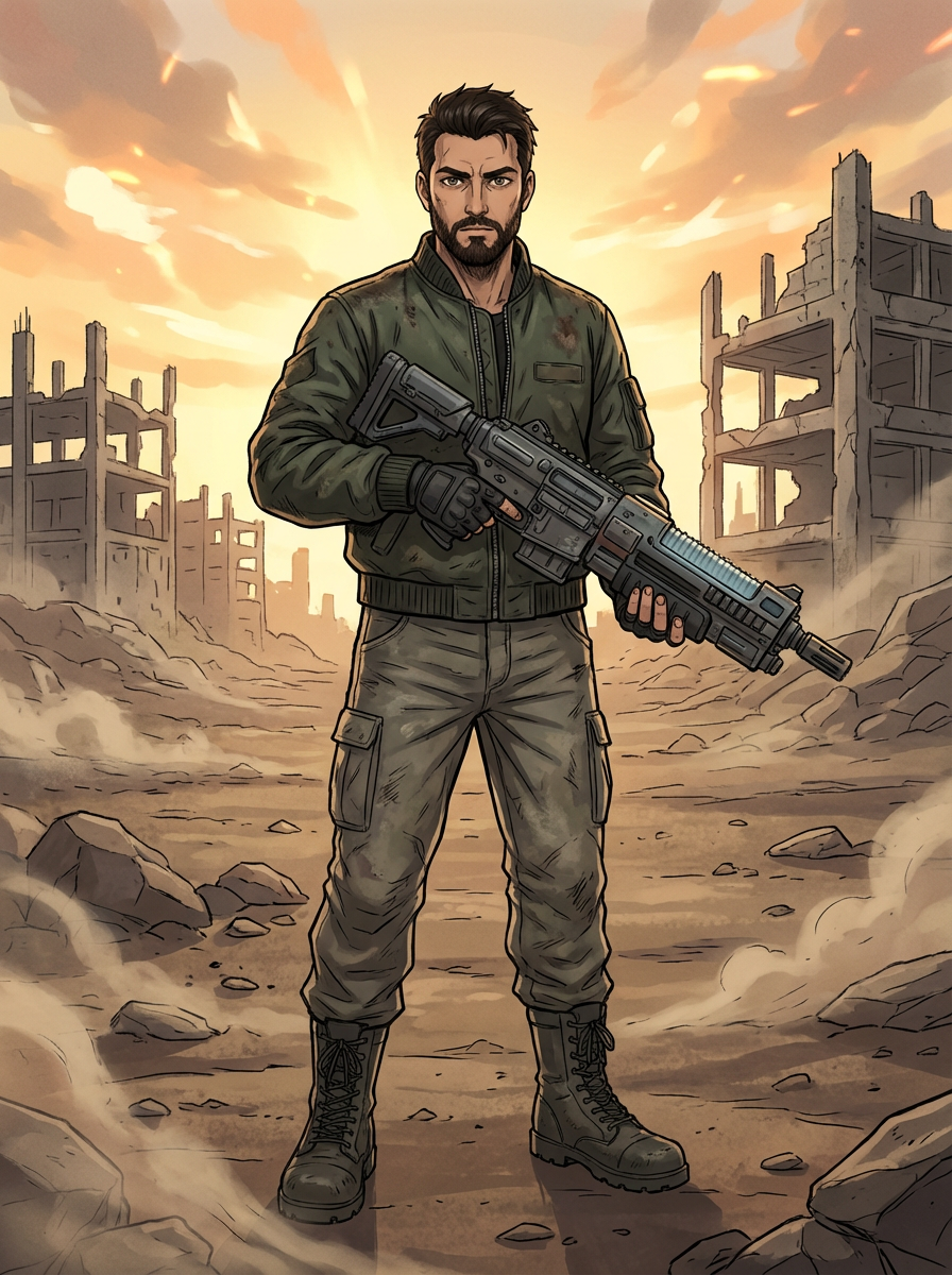 A rugged anime survivor in a desolate wasteland, gripping a futuristic rifle. The character wears a weathered bomber jacket with tactical gloves and combat boots . The background features crumbling buildings and a glowing orange sky, evoking a dystopian feel. The style is in anime illustration.