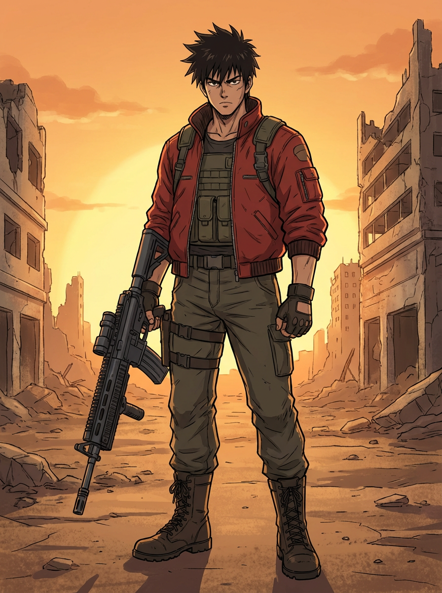 A rugged anime survivor in a desolate wasteland, gripping a futuristic rifle. The character wears a weathered bomber jacket with tactical gloves and combat boots . The background features crumbling buildings and a glowing orange sky, evoking a dystopian feel. The style is in anime illustration.