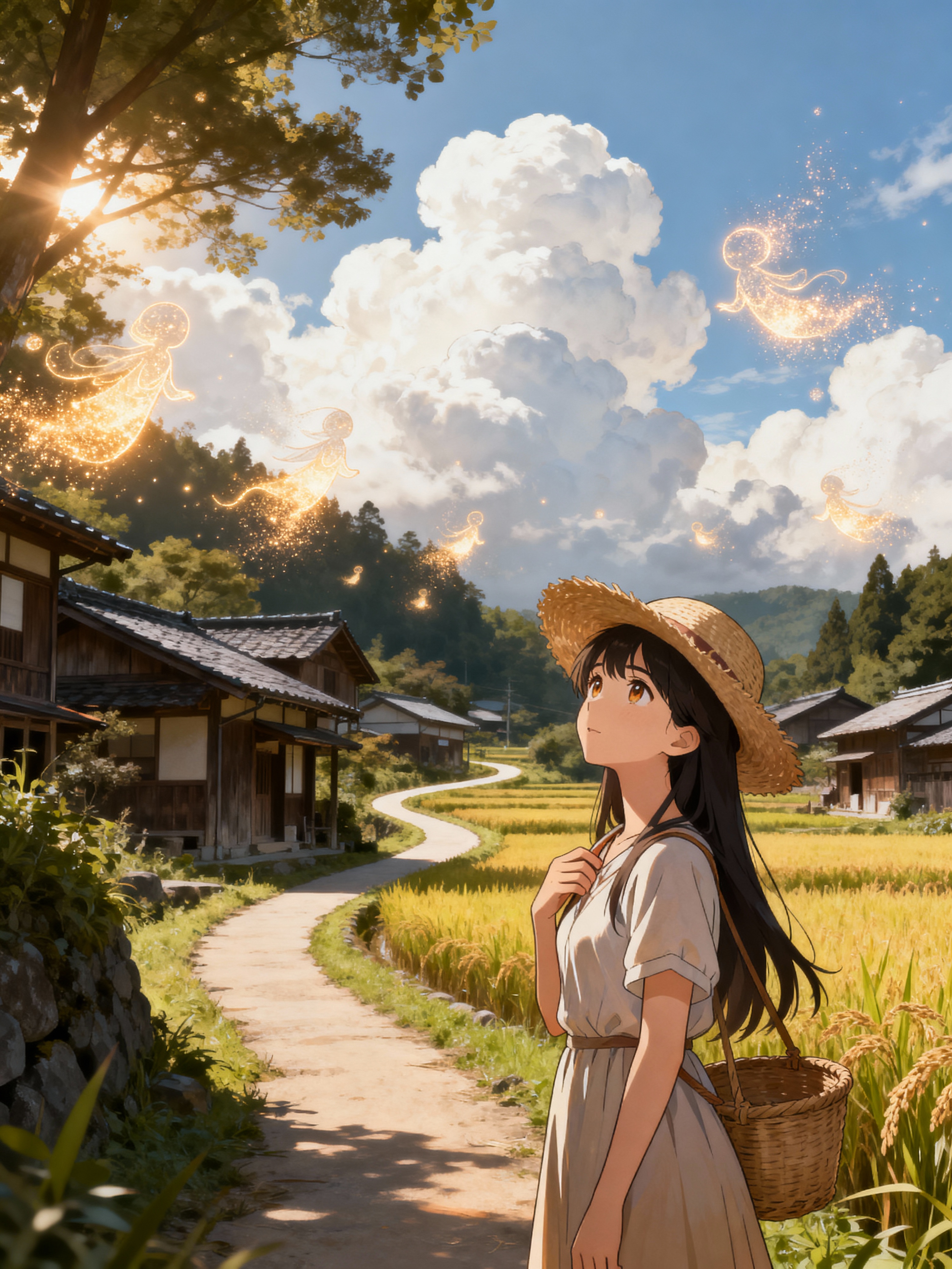 A serene line art anime scene in a Japanese countryside. The path winds between traditional wooden houses and rice fields, with fluffy white clouds drifting overhead. Magical dust spirits dance in the warm sunlight that filters through the trees. In the foreground, model as a gentle character stands thoughtfully, wearing a simple summer dress with a straw hat and carrying a basket . The character has a kind expression, watching the spirits play. The scene captures the peaceful magic of everyday life, painted in soft, warm colors.